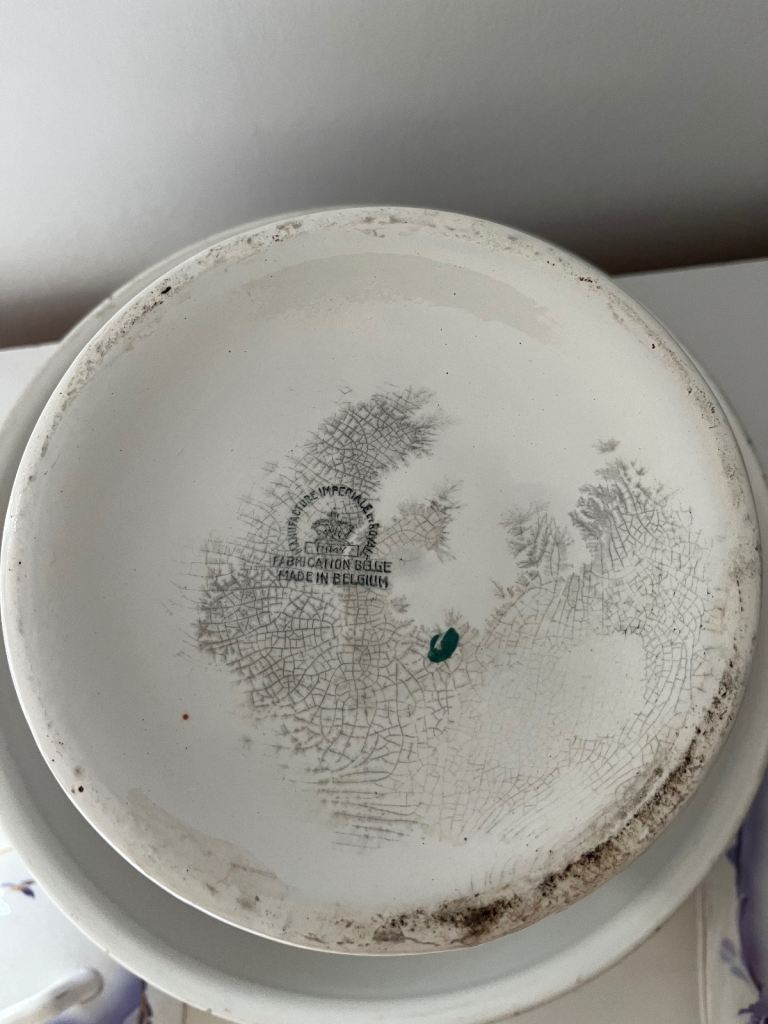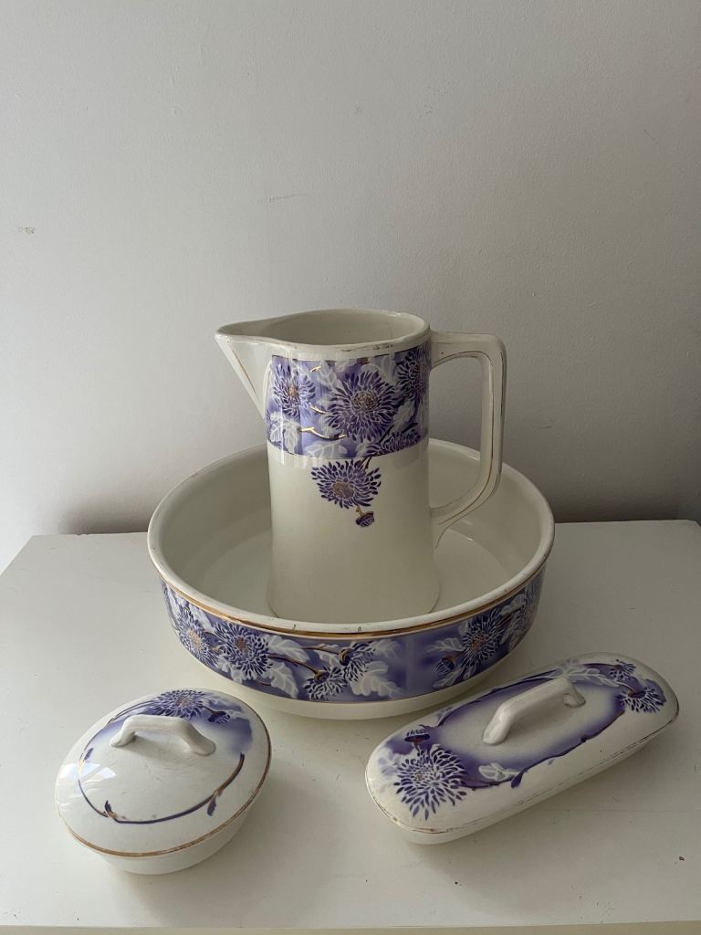 Antique Belgian Imperiale Royale (Nimy) Jug & Bowl/ lidded soap dish/ lidded comb dish set.