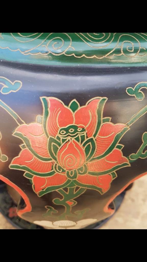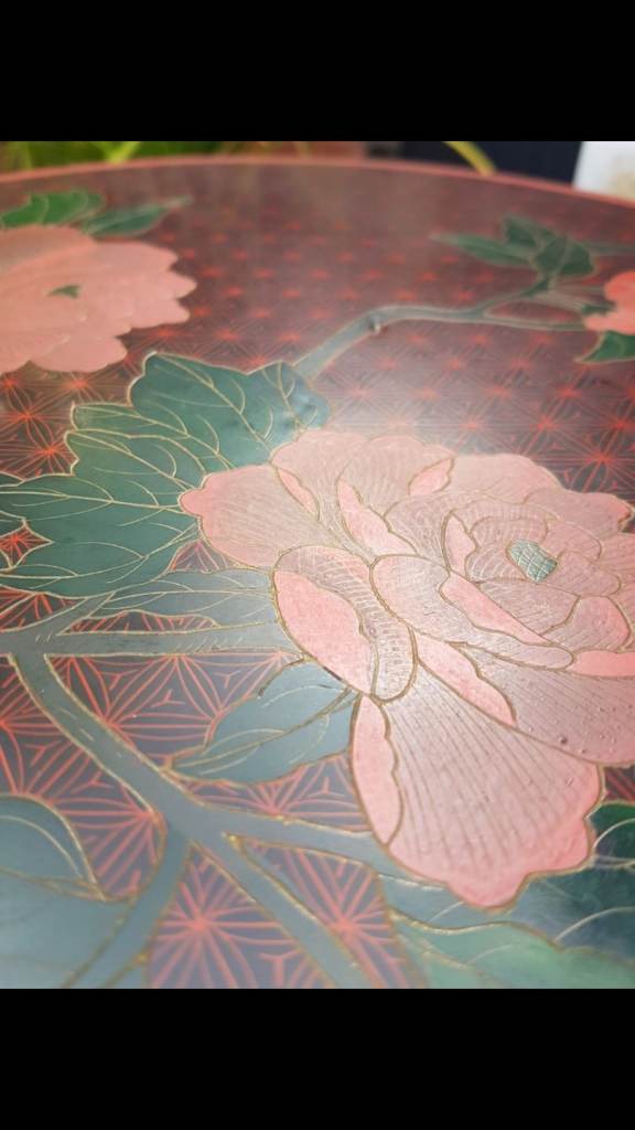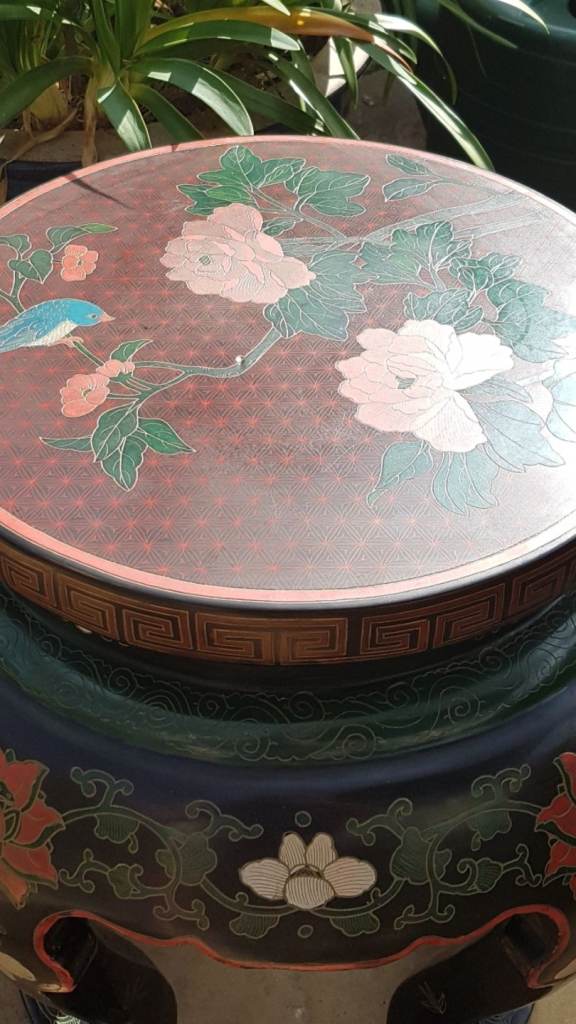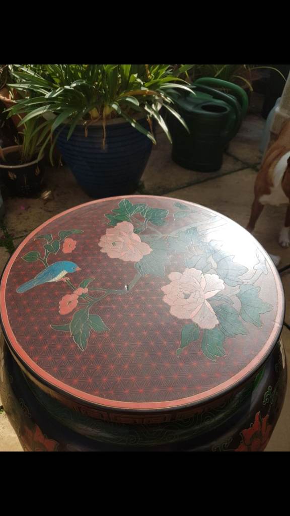 Truly masterful work in this Garden Stool. Topped with finely crafted cloisonne still life with flowers. Black lacquer frame with flowers and foliage. Just beautiful. Minor wear. See all pics for condition. Expect to pay £1500 and up retail. Excellent piece! 21H x 18W inches