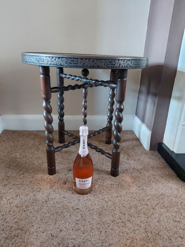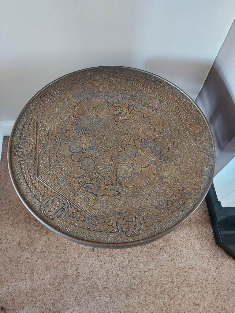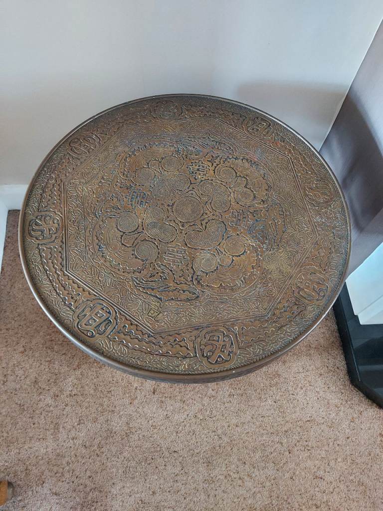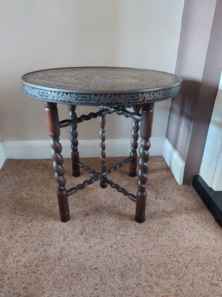 £99. An antique circular brass-topped folding colonial campaign table. Believed to be late-Victorian (late 1800's), it is in very good condition with only minor marks from age and use. The ornately moulded and etched brass table top is supported by folding, barley-twist shaped legs and is sound and solid. Standing approx 58cm tall it has a diameter of approx 59.5cm. Inspection without obligation is invited! Barnet EN5 5BE location. Collection preferred! Local delivery considered. Will deliver free of charge to Barnet, St.Albans, Watford, Welwyn, Hatfield, Finchley, Edgware, Stevenage, Mill Hill, Ealing, Whetstone, Hemel Hemstead, Enfield, Wheathampstead, Harpenden, Potters Bar, Letchworth, Aylesbury, Muswell Hill, Southgate, Hertford, Ware and environs. If you live elsewhere, please contact me to see what I can do!