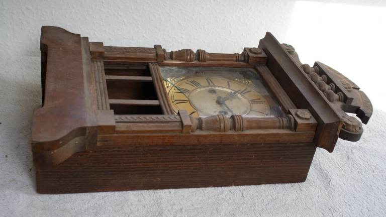 ANTIQUE CLOCK FOR RESTORATION, USED BUT IN FAIR CONDITION, DUSTY BUT LOOKS TO BE ALL THERE.