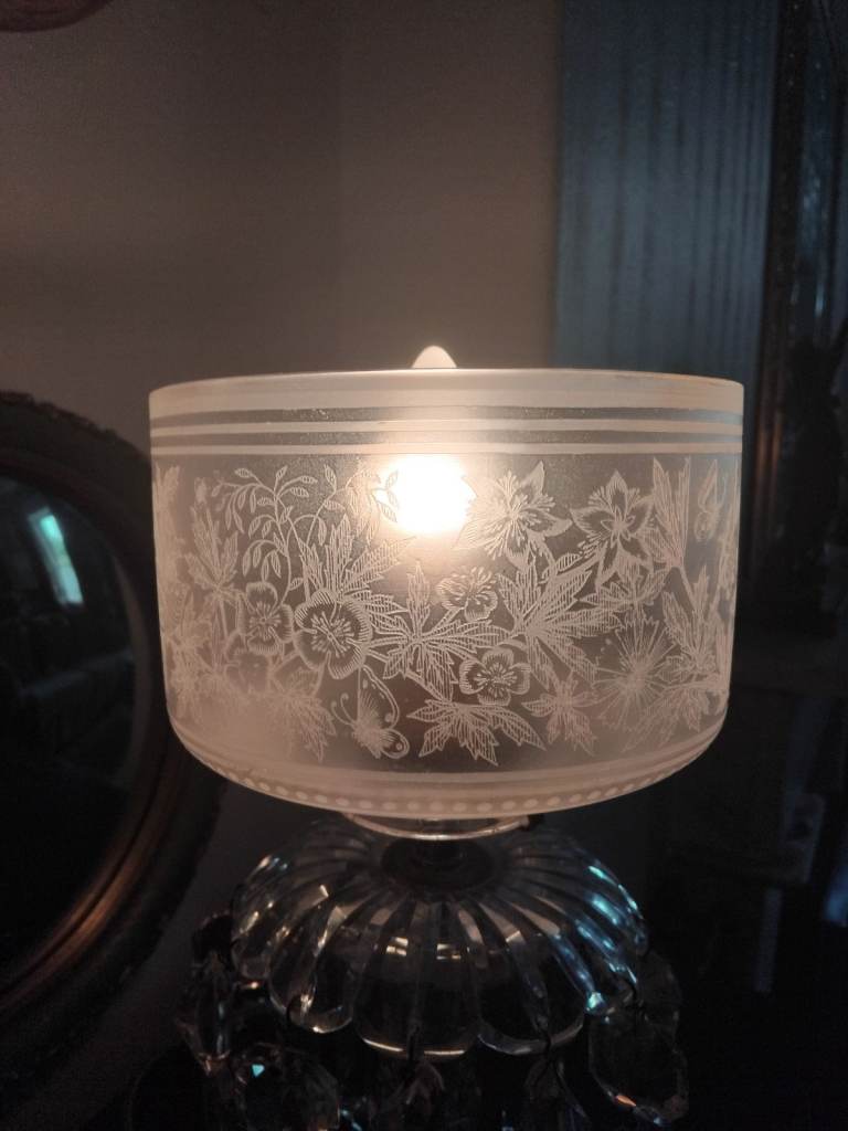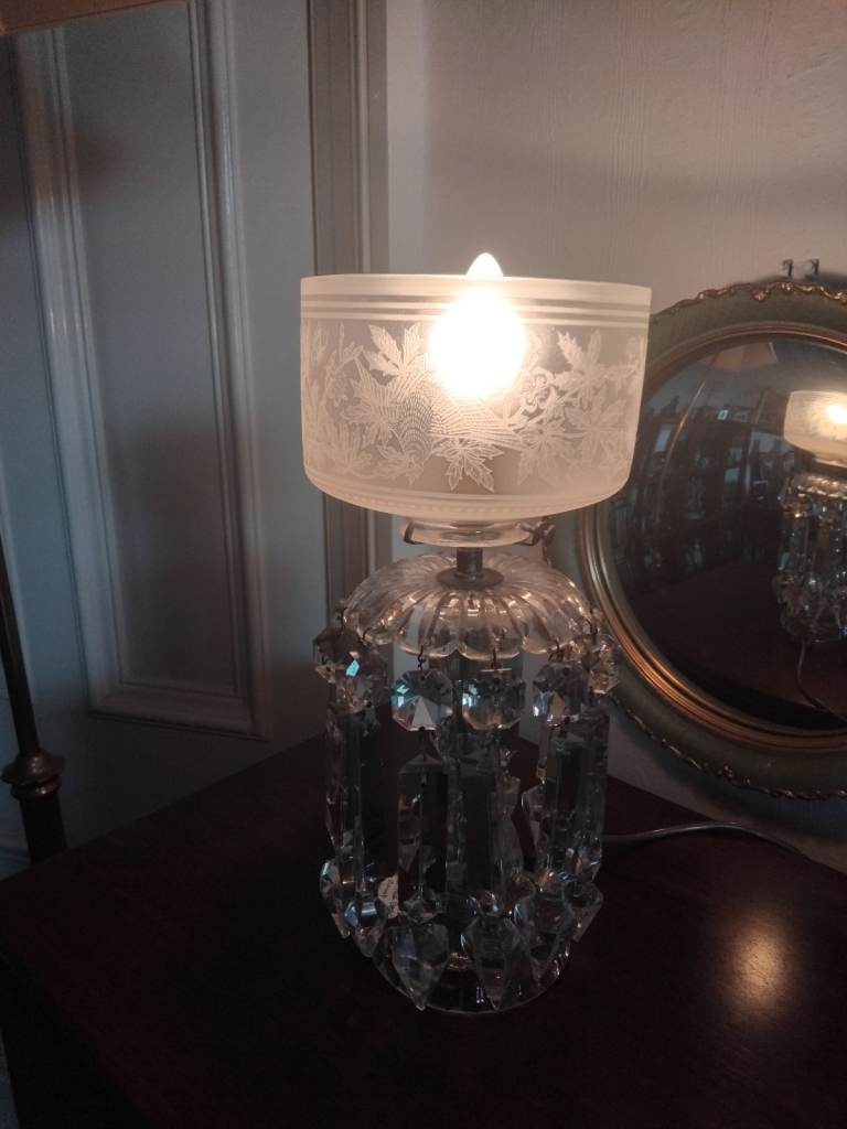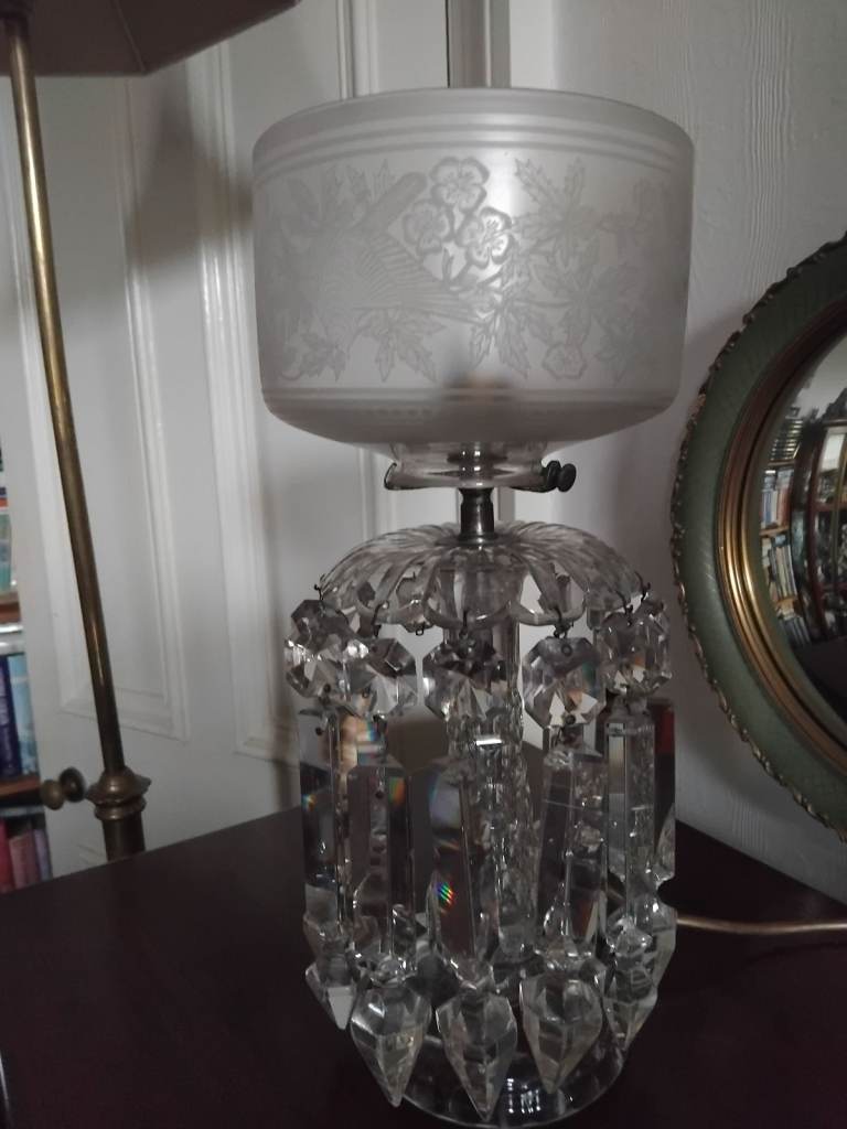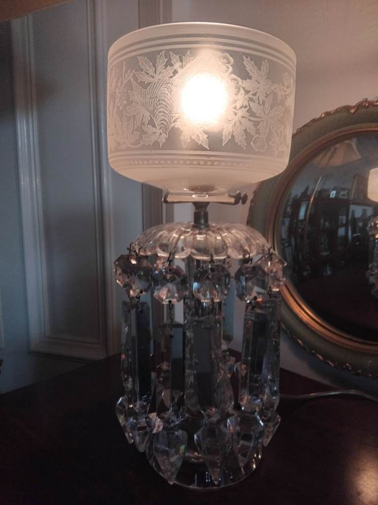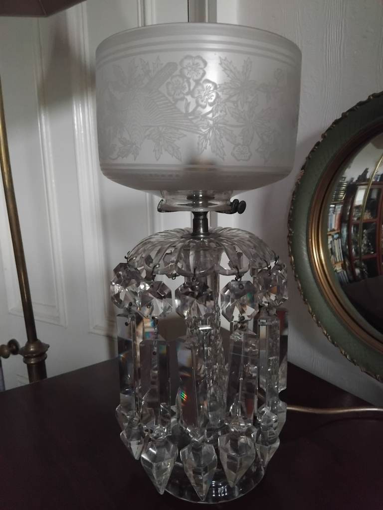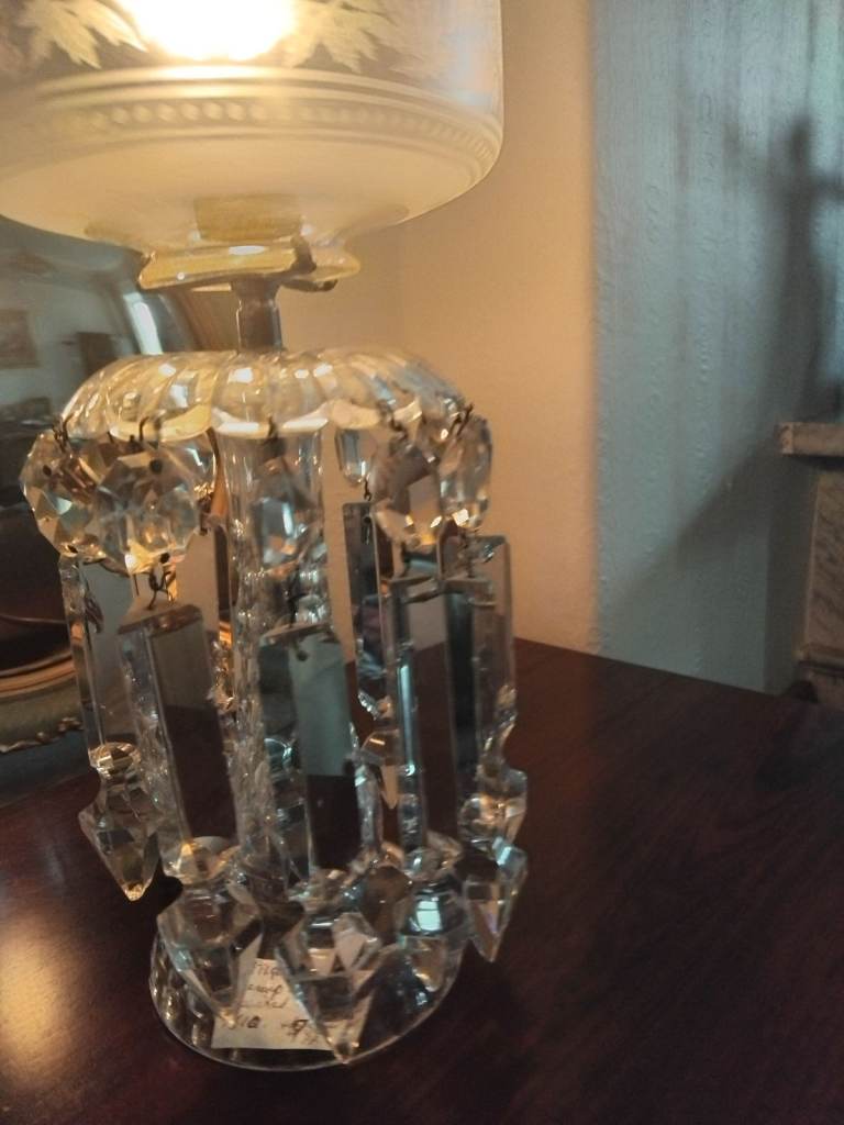 Electric Antique Crystal Lamp. With original gas fitting. Beautiful condition apart from one missing Crystal Drop which you can replace through the Internet.