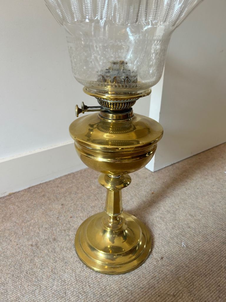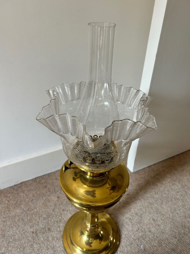 Antique brass oil lamp, dating from the Victorian or Edwardian era. Features a polished brass base and font, a clear glass chimney, and a decorative, wavy-edged glass shade. Typically equipped with a brass burner, sometimes featuring double burners for increased brightness. highly collectible.
