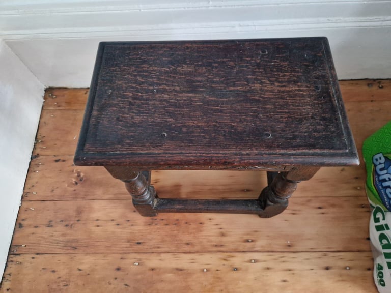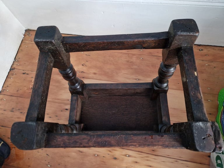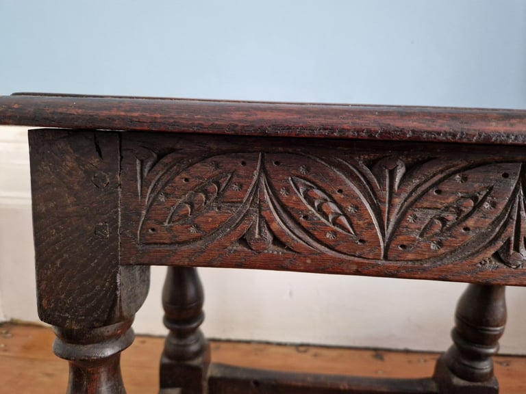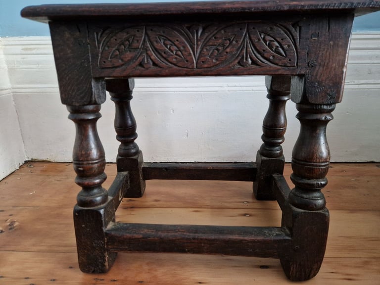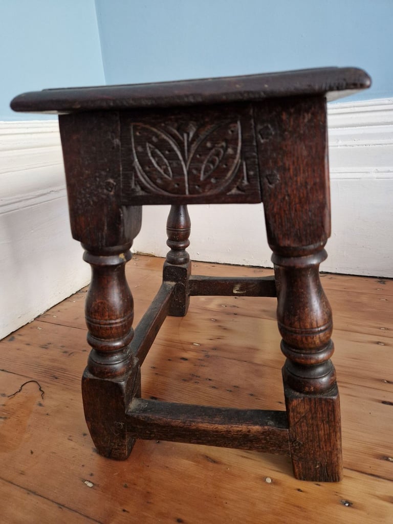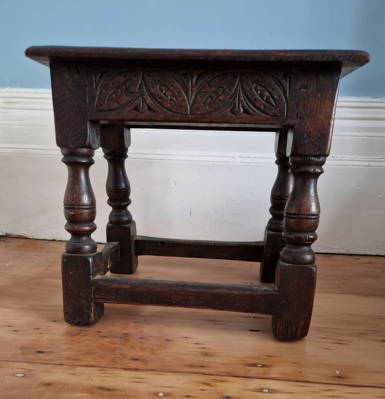This Antique English Footstool Bench Stool presented in a 17th century style is a beautifully crafted piece of furniture from around 1900. 40cm high, 44cm lenght and 26cm wide.