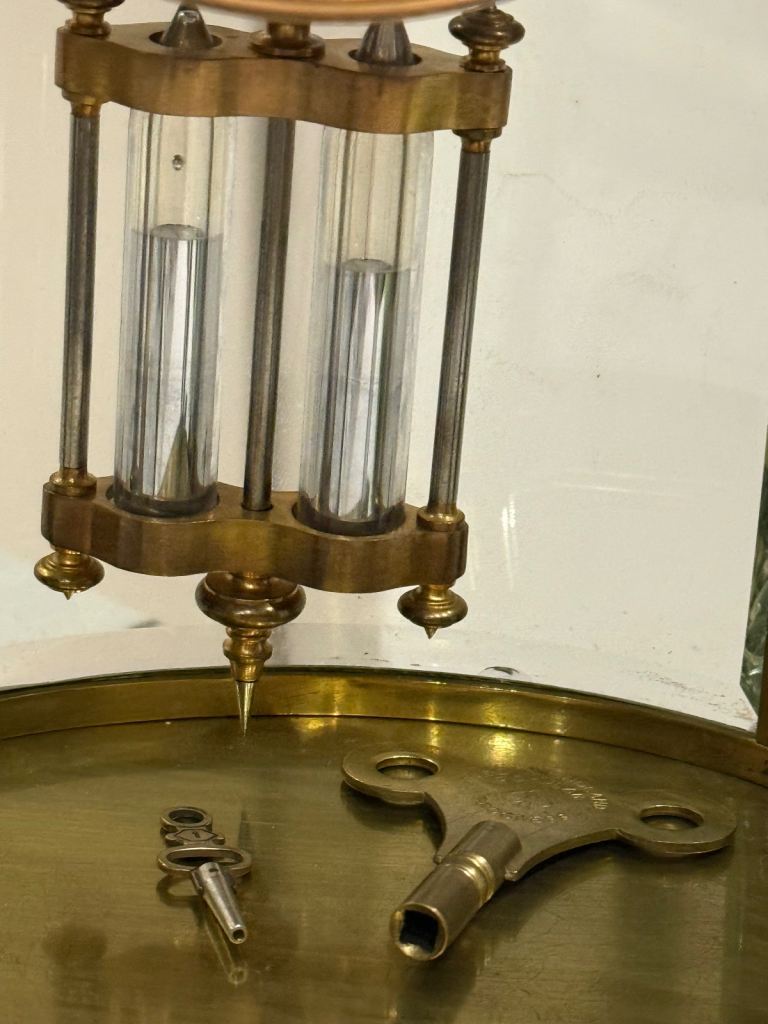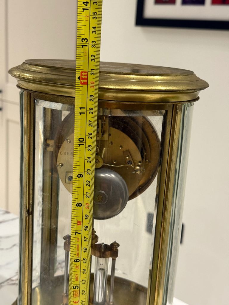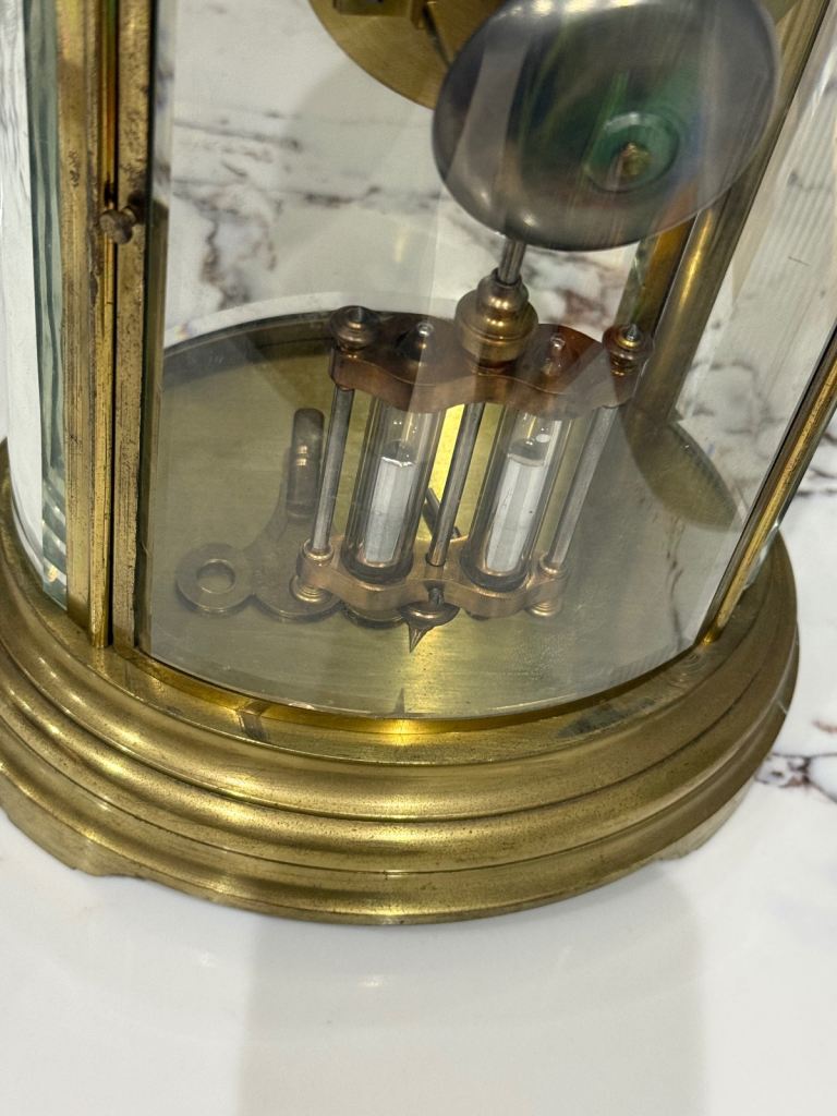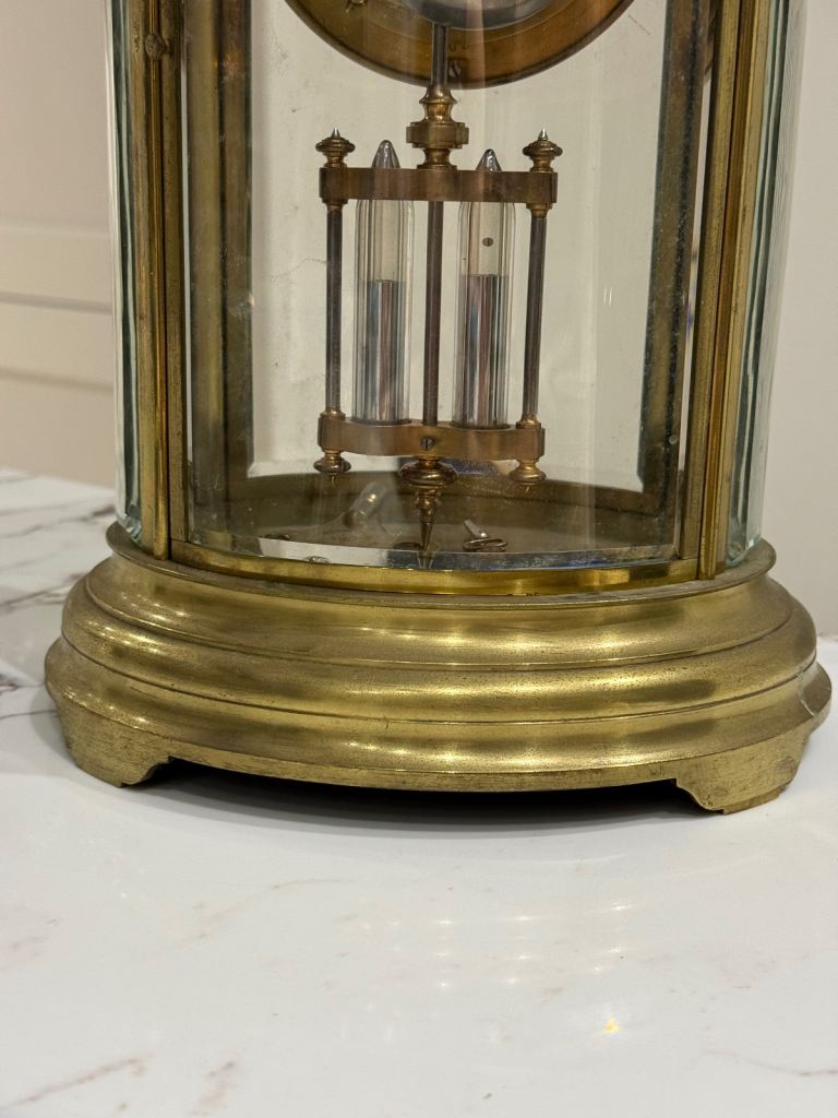 Elegantly proportioned French oval four glass striking mantle clock with visible escapement (of type often referred to as a Crystal Regulator), by Samuel Marti et Cie.