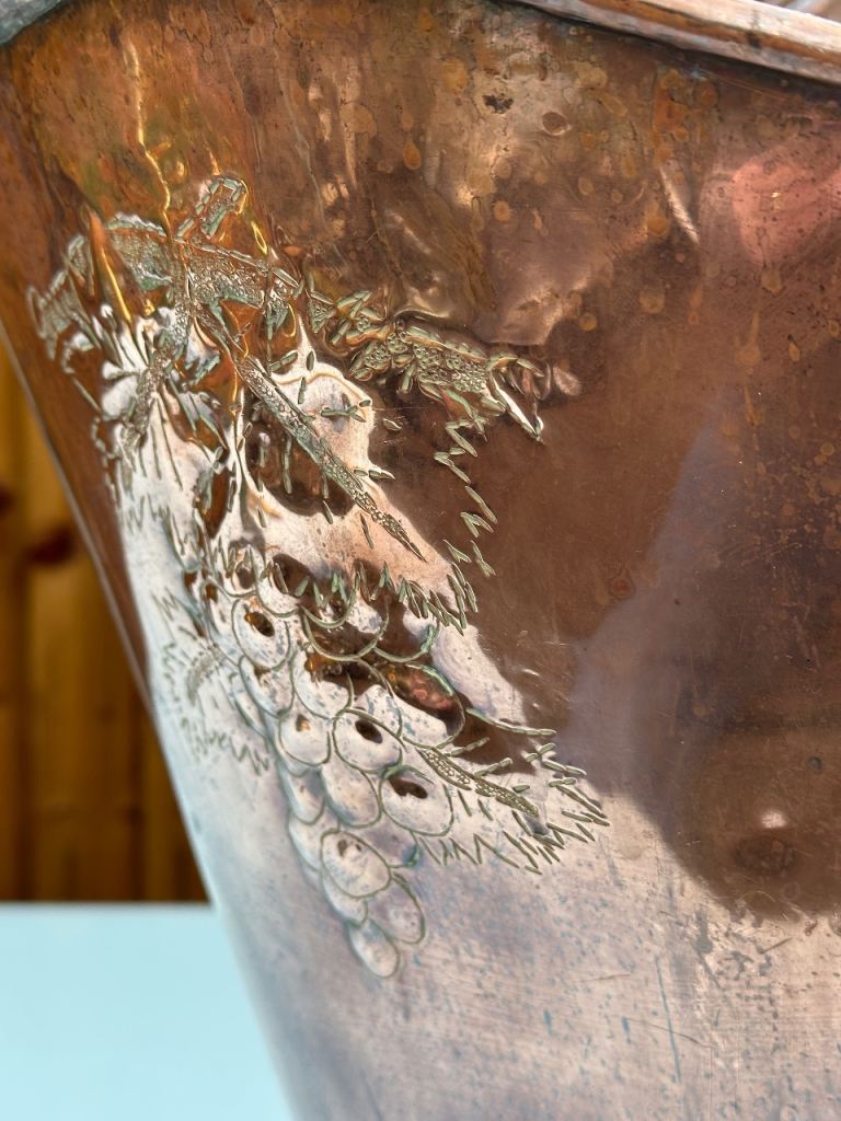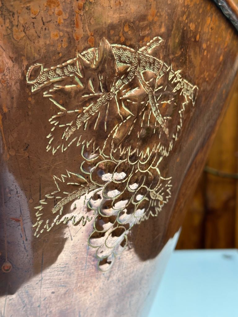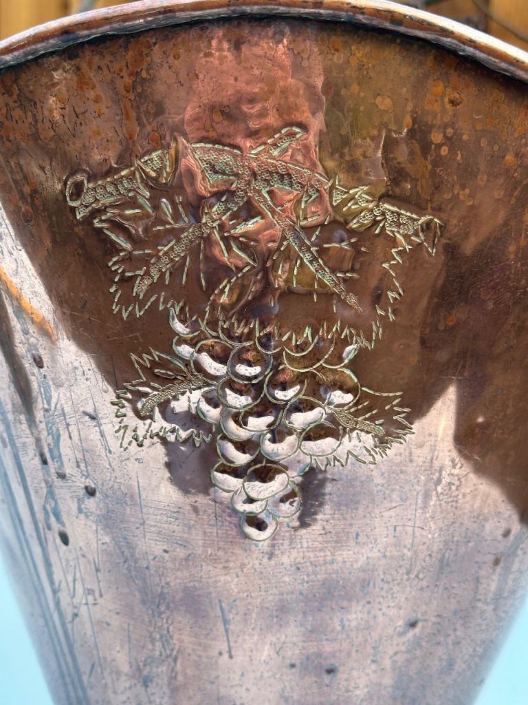 A big handmade artisan piece with planished copper and a decorative repousse, pushed from behind, design of a bunch of grapes on the vine to the front, it’s really attractive.
