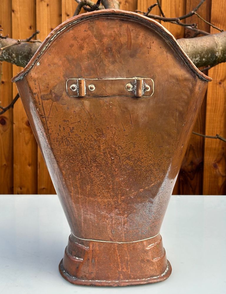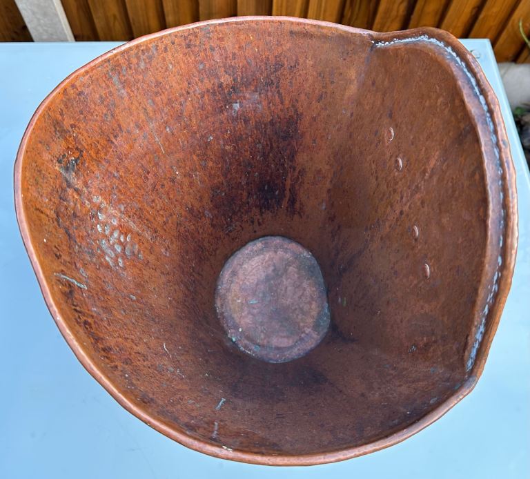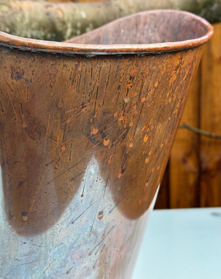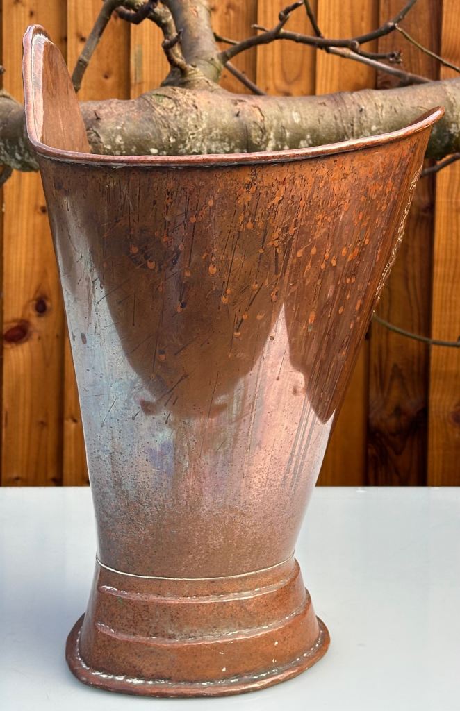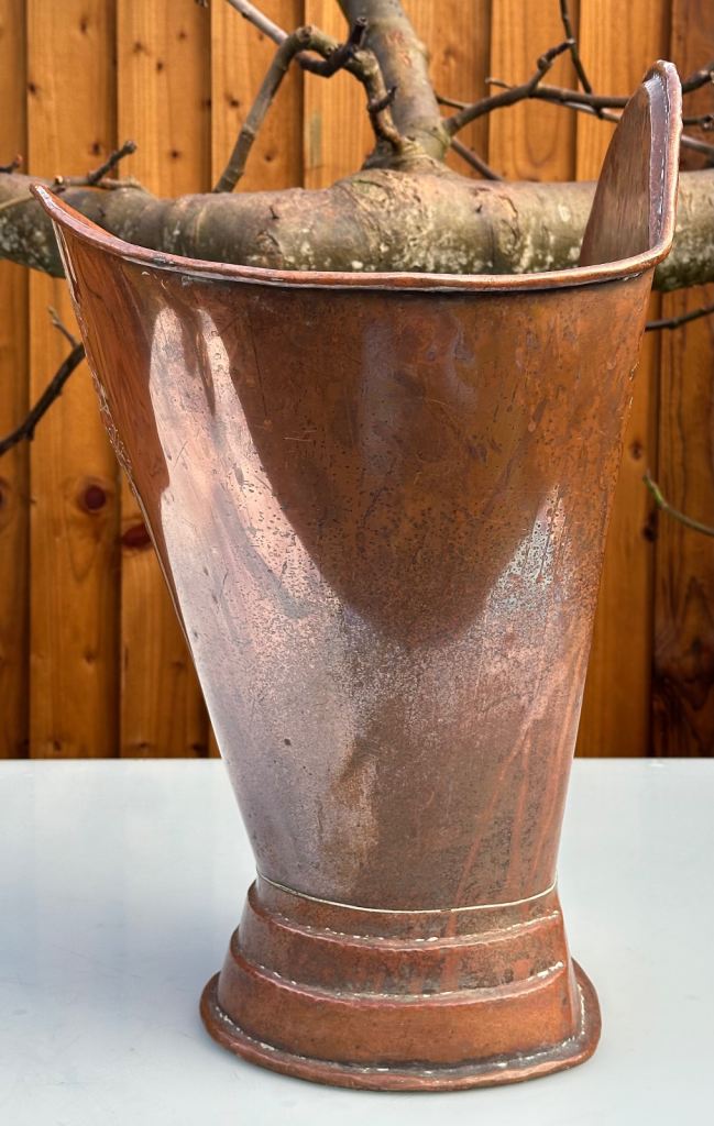 It’s a sturdy copper bucket in the shape of a grape hod that I’m advised dates to around the early 1900s and is Art Nouveau/Arts & Crafts in style.