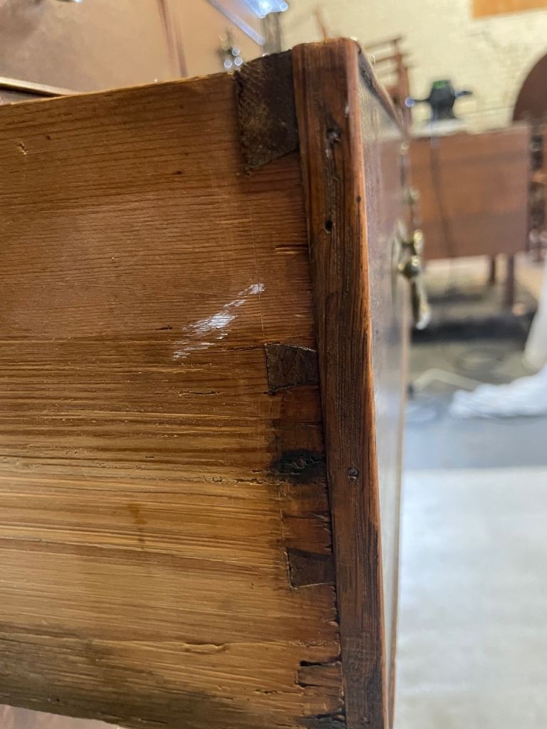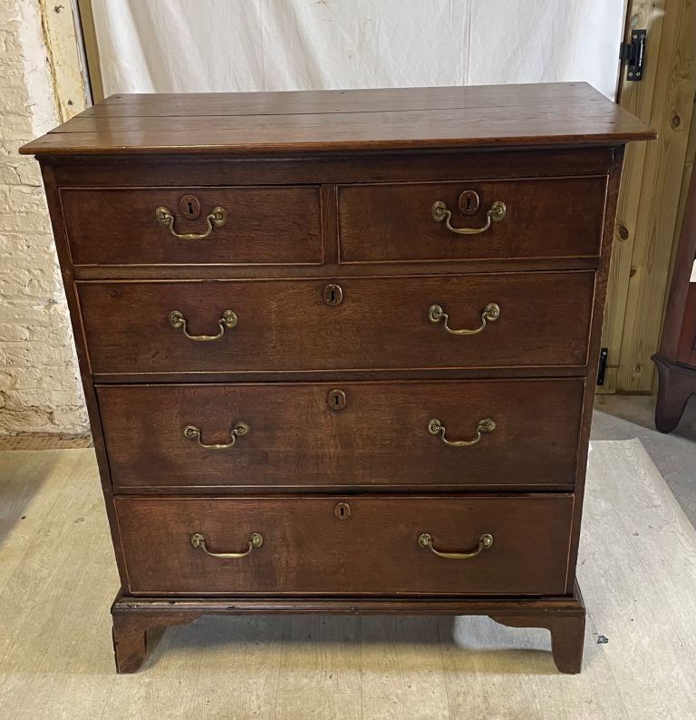 2 small over 3 larger graduated drawers constructed of dovetail joints with brass drop handles and a 2 plank top all standing on bracket feet.