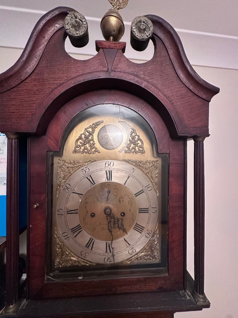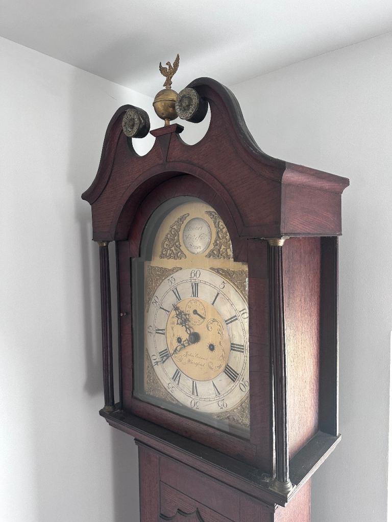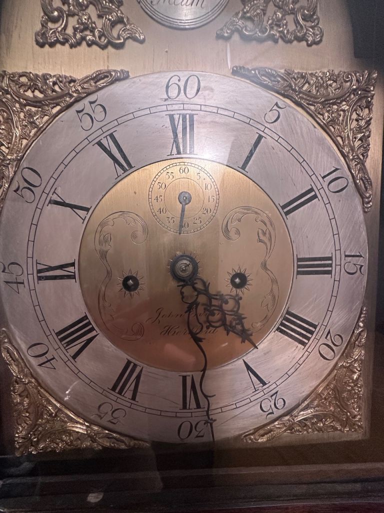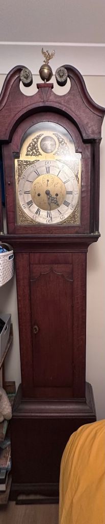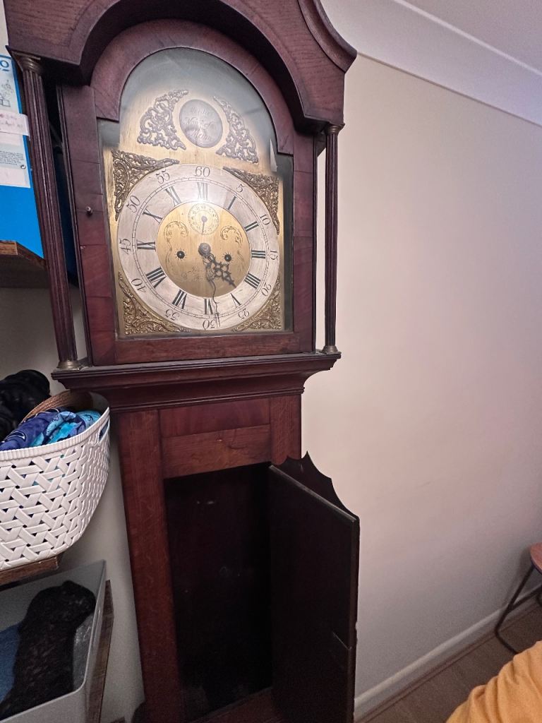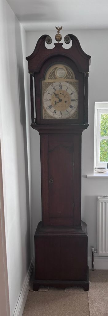 Antique long case grandfather clock for sale due to lack of space in new home. Clock in working order, marked with “John Evans Hertford “ on the brass face.