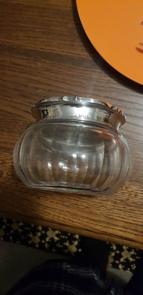 Antique Halmarked silver glass trinket bowl l.ion mark anchore .mark.lovely shape collection in perth only