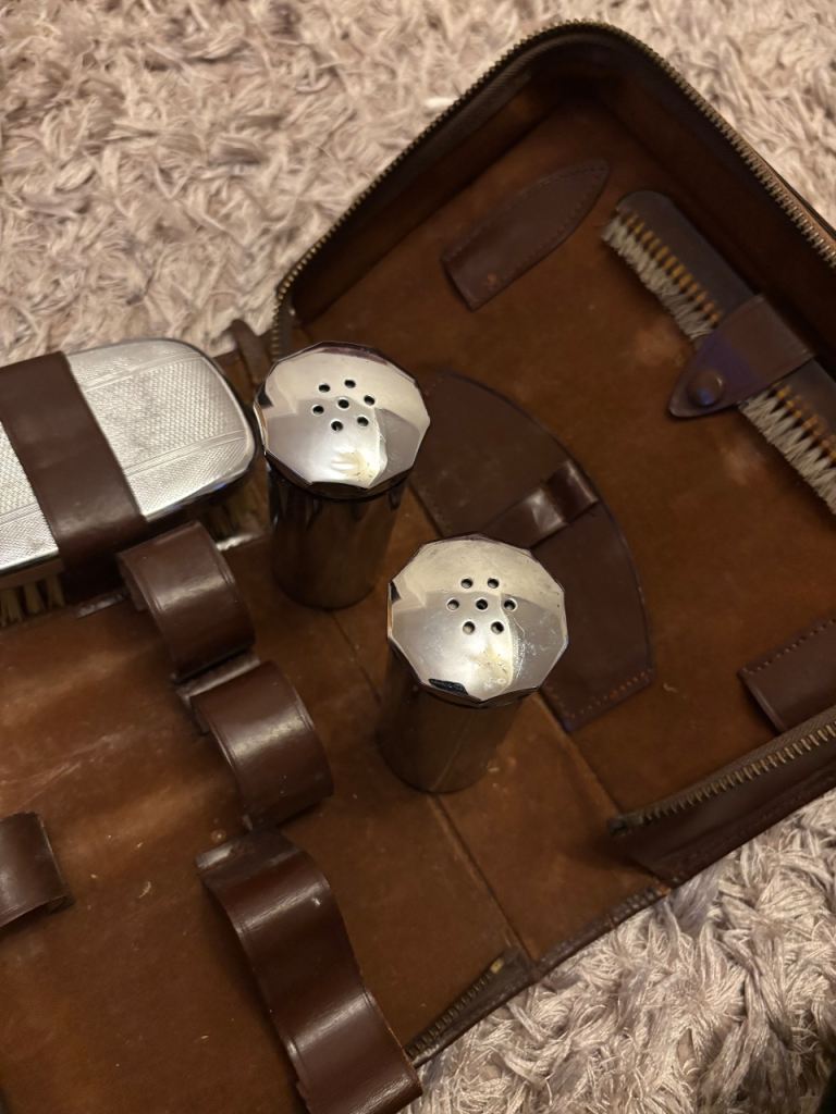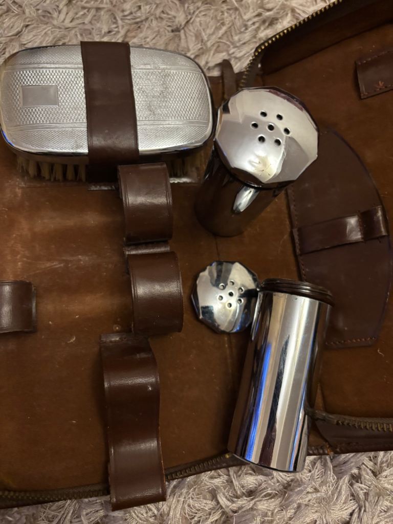Includes brushes and 2 chromium coated powder silver containers - includes wax for shoes