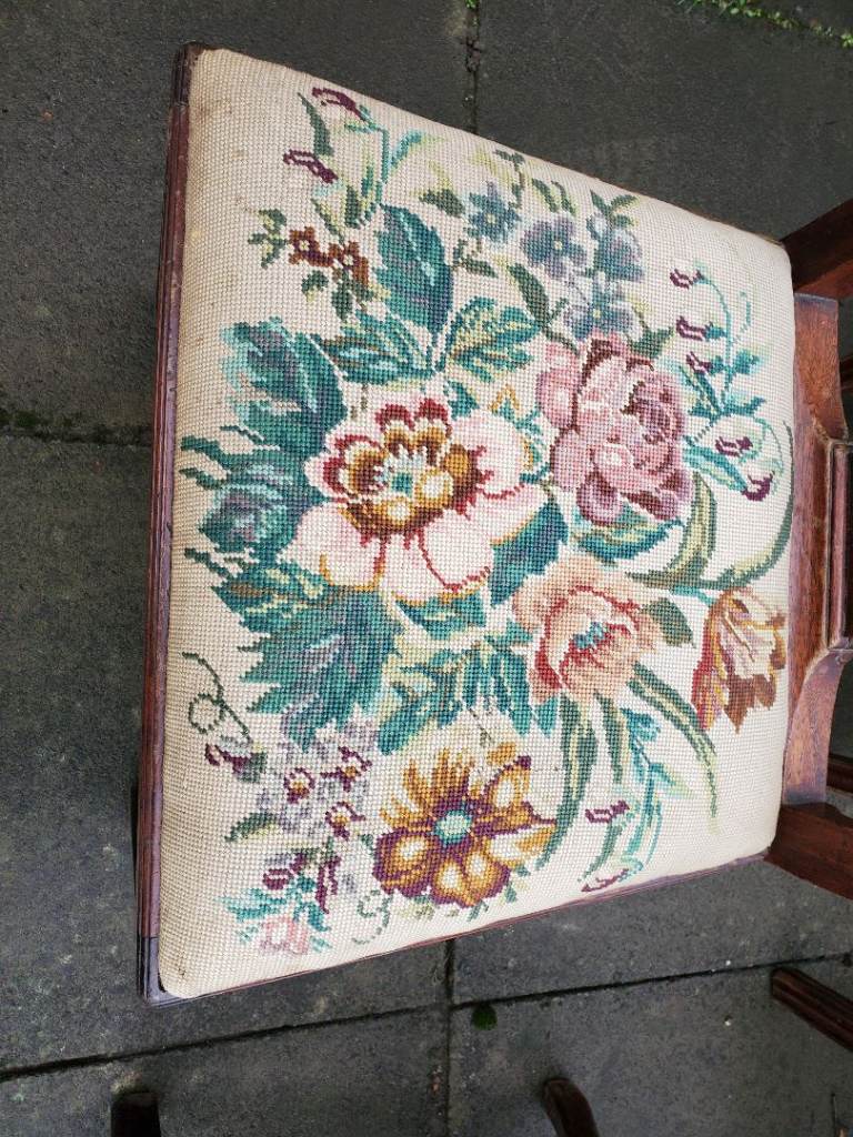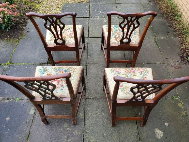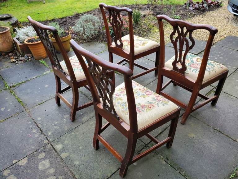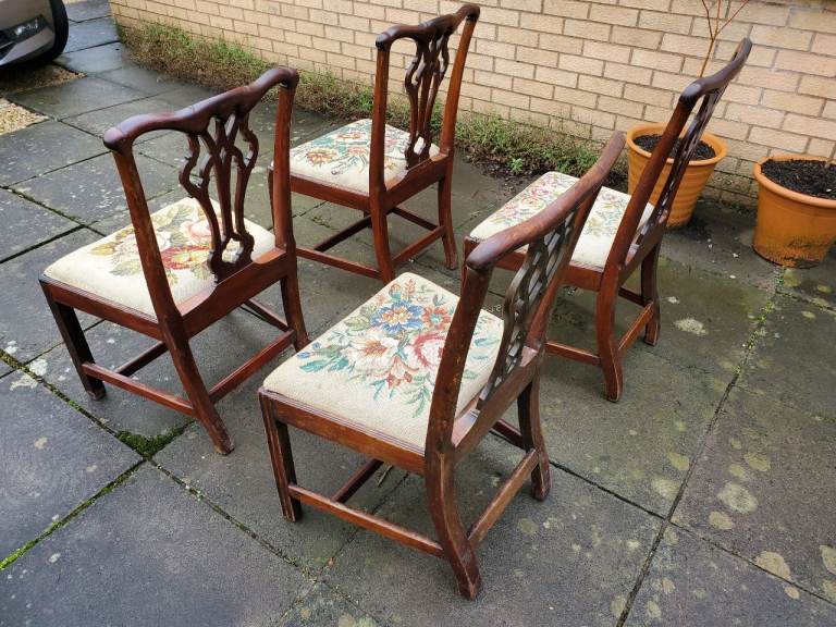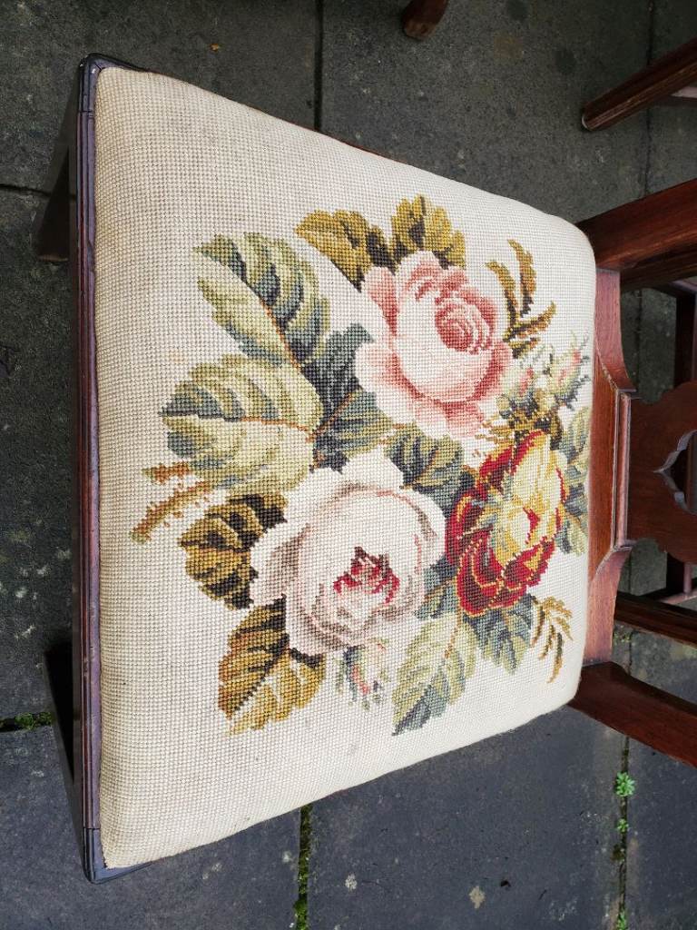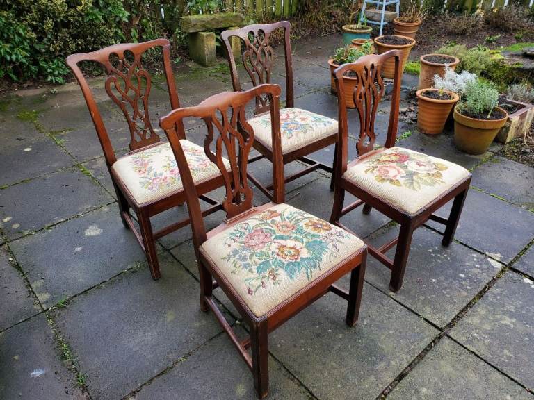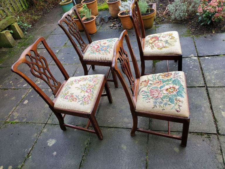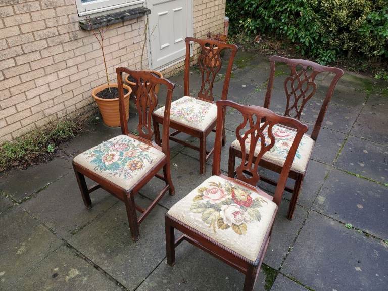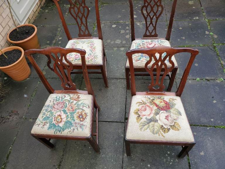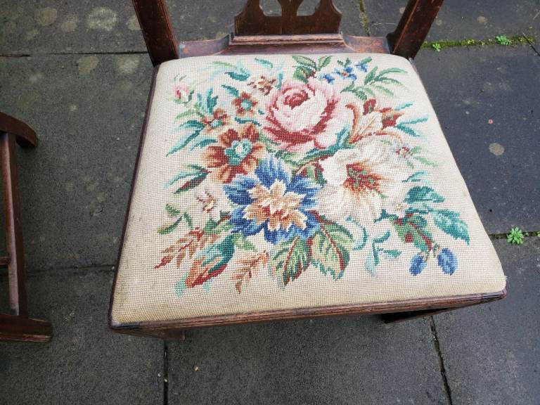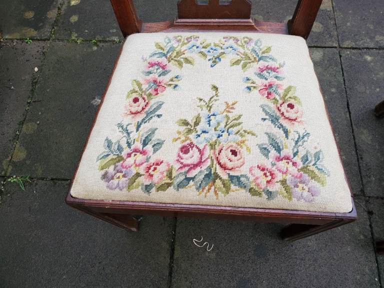 Set of matching early 19th century mahogany chairs. Seats covered in very pretty handmade antique needlework (‘tapestry’) seats. Good for immediate use. £40 each. Collection from south side of Glasgow.
