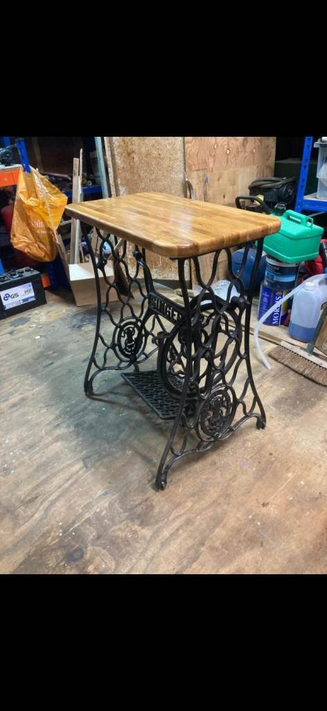 Sympathetically restored singer sewing machine tredle base, with new wooden table top.
