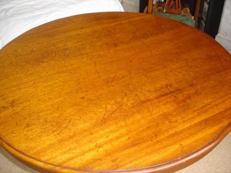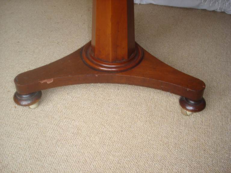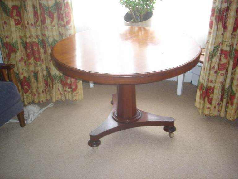 Mahogany round table on pedestal base with tripod feet original castors. Was originally a tilt top table but I have always had it screwed in place so not sure if it can still do that. Good original condition. This is early Victorian. Small damage to foot area (see photos but decorative and hardly noticeable unless you look under the table for it its a bit of missing veneer. ) Table is lightweight and could be transported in a large estate car. Location Edgbaston about 2 miles from central Birmingham and just off Hagley Rd (A456) easy access as in a downstairs room . Cash on collection sorry no delivery option. Any questions do ask. Thanks for looking.