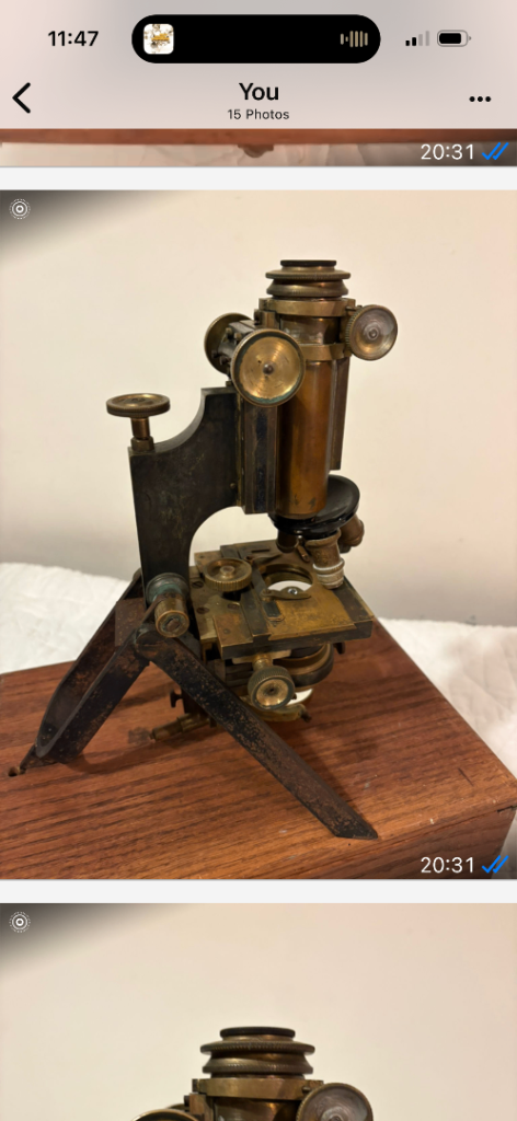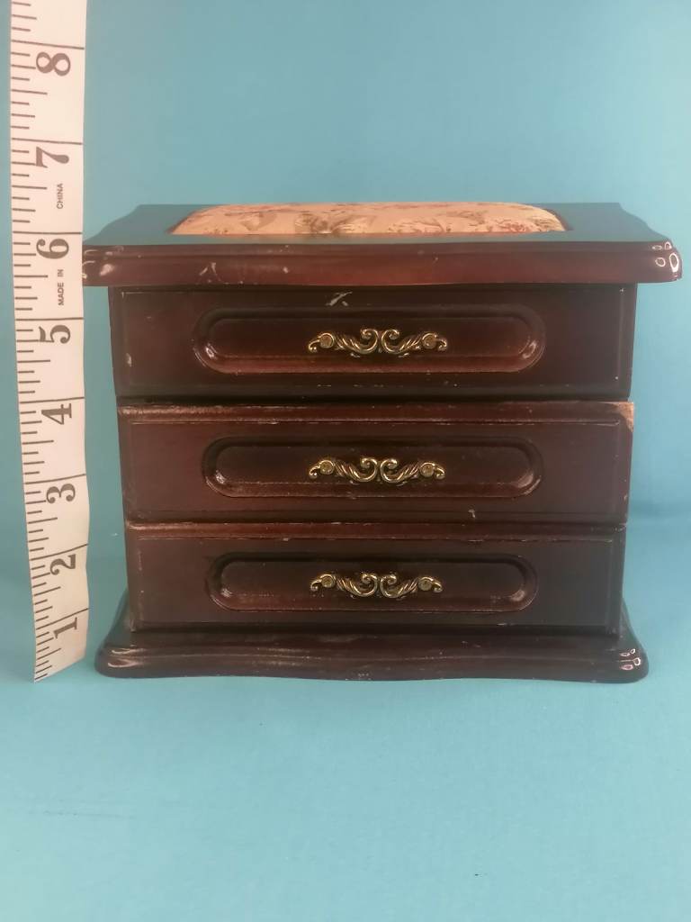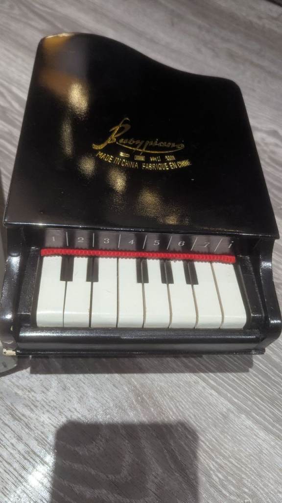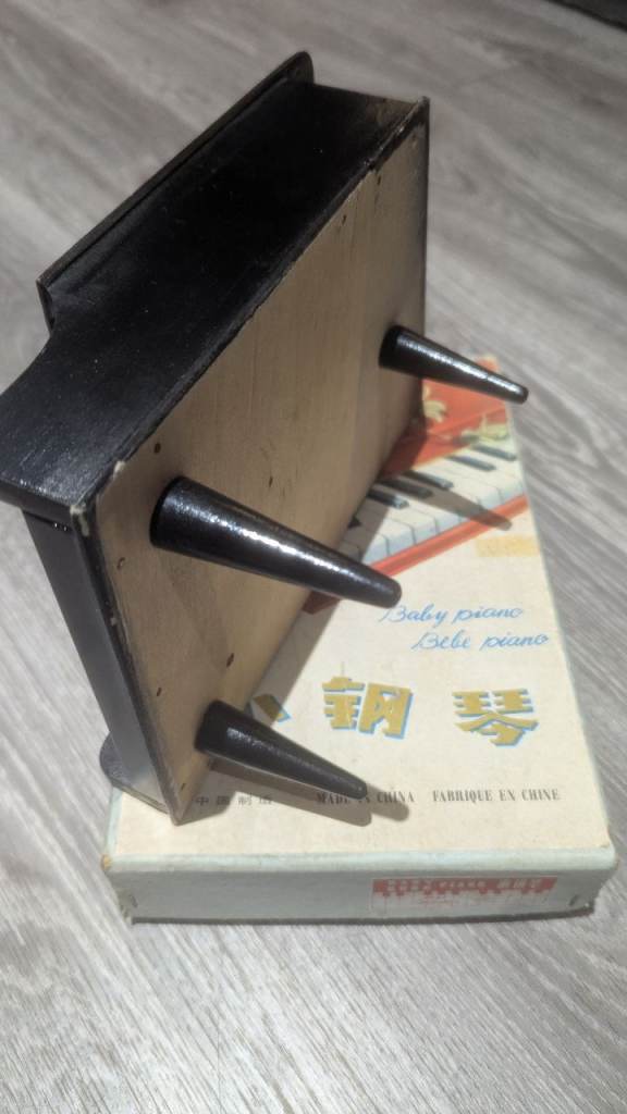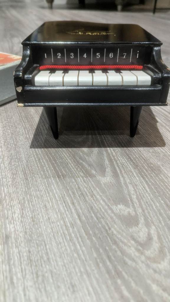 Not sure how old this toy piano is, however it comes in its original box, has 3 screw in legs and works perfectly.