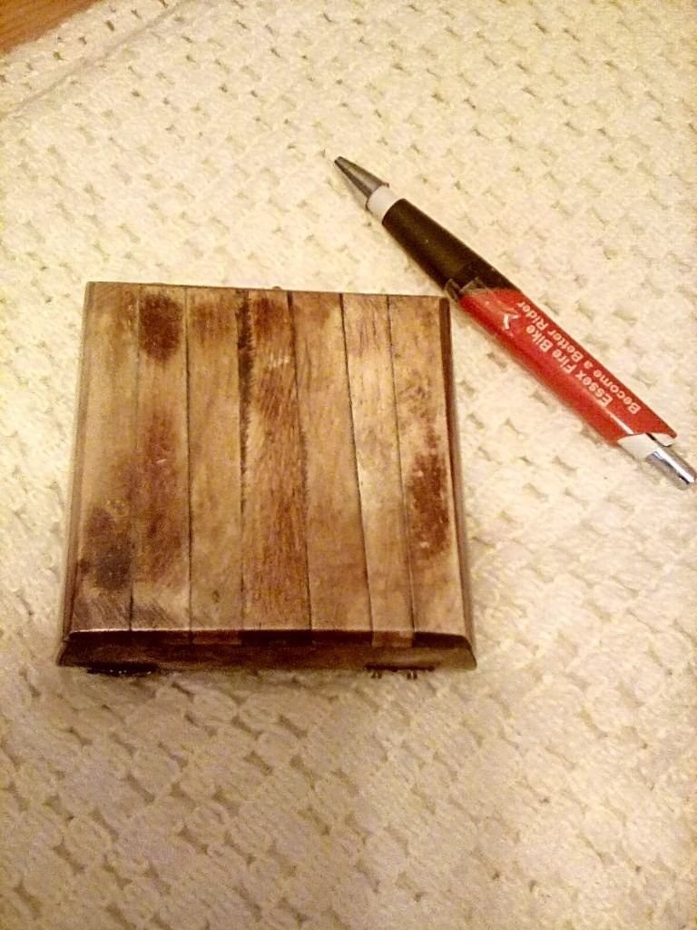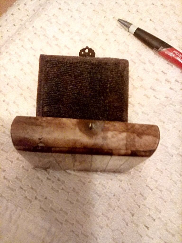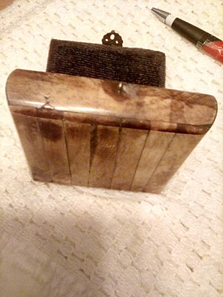 Antique trinket box with marquetry.covering box has lid with metal clasp interesting item..