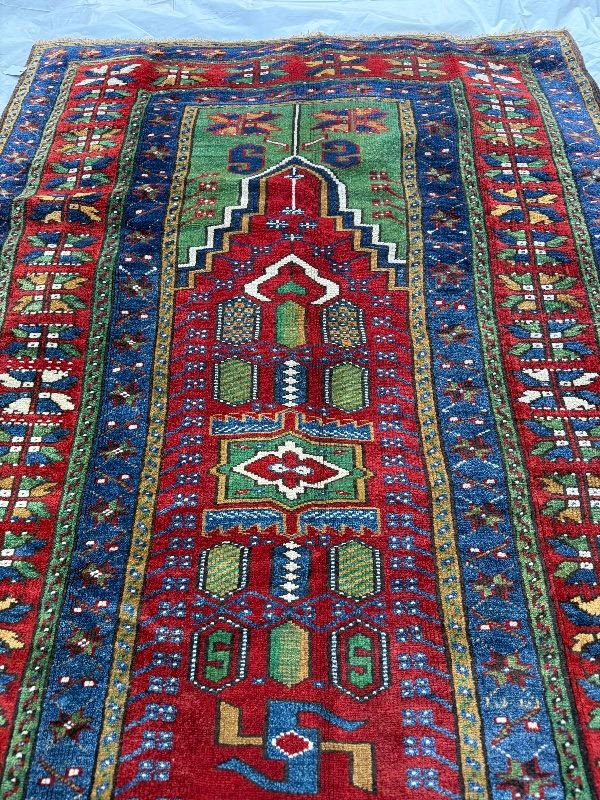 This beautiful handwoven rug features a striking Anatolian-style prayer design, highlighted by bold geometric motifs and rich traditional colors. The deep red field is complemented by shades of navy blue, green, ivory, and earthy accents, creating a vibrant yet timeless composition.