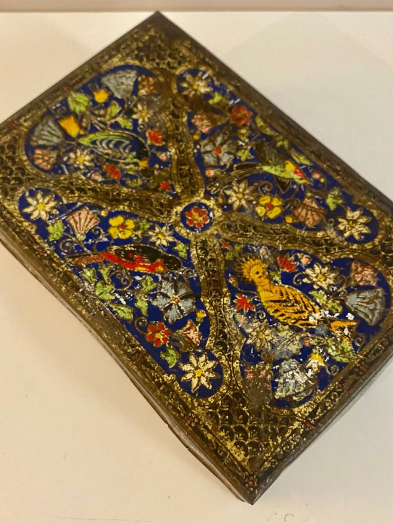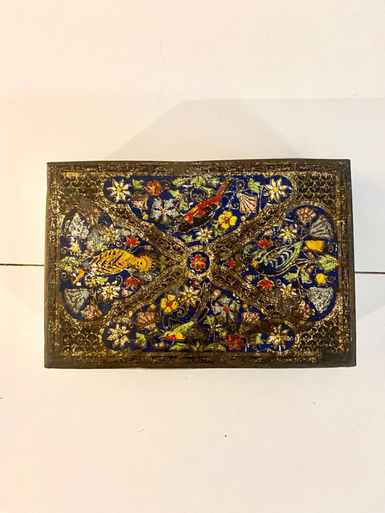 This vintage antique biscuit tin from the 1940s is a rare find, featuring intricate bird decorations and a unique ornate design.