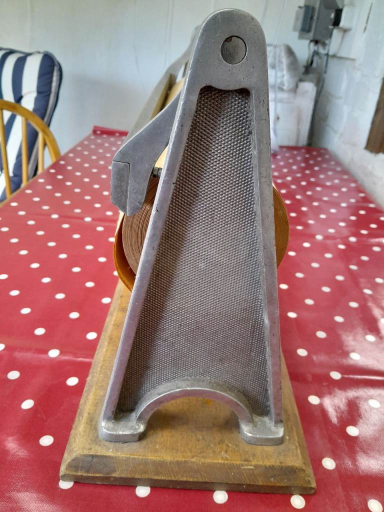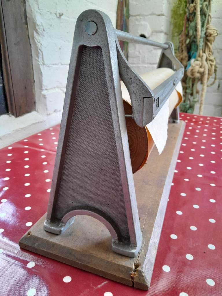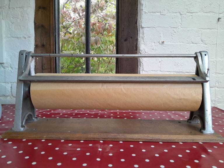 Rare vintange item! Cast metal and wood wall mounted wrapping paper dispenser with large roll of brown wrapping paper. Cutting bar flips back to enable paper roll to be lifted out. Wooden panel size 79 x 20 cm, four holes predrilled for fixing to a wall or workbench/table. Metal supports 33 cm high. Paper roll 61 cm wide. Well used condition, some water marks on paper, see photos.