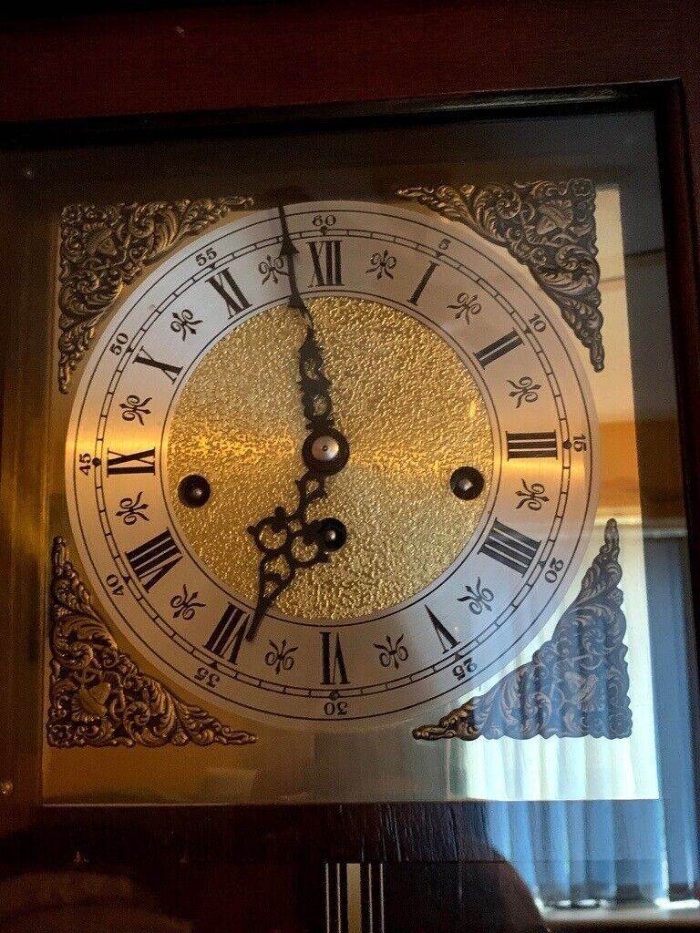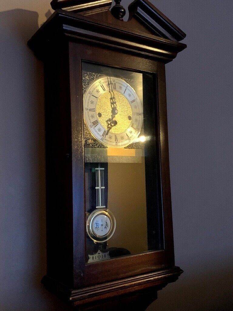 For sale we have a Vintage Bulova Grandfather Pendulum Chiming Wall Clock.
