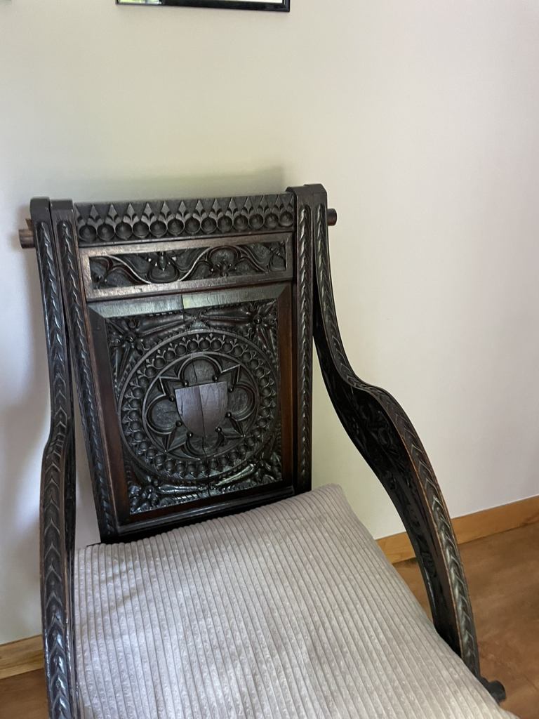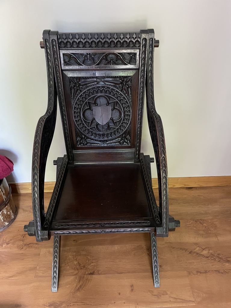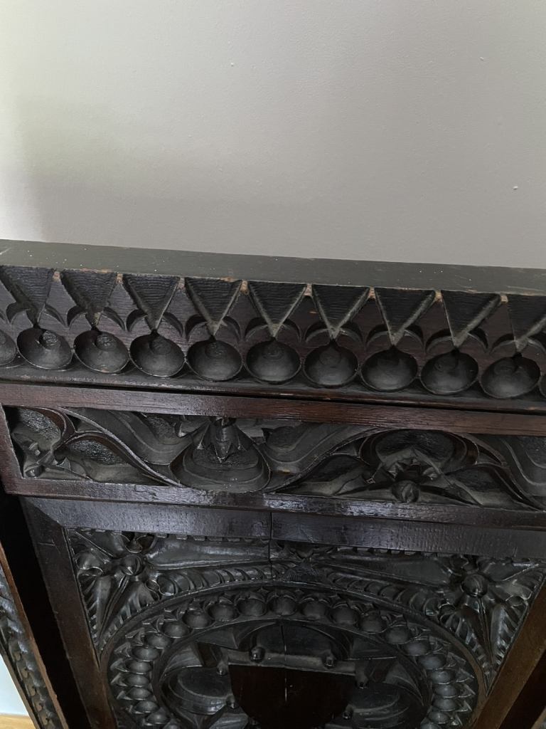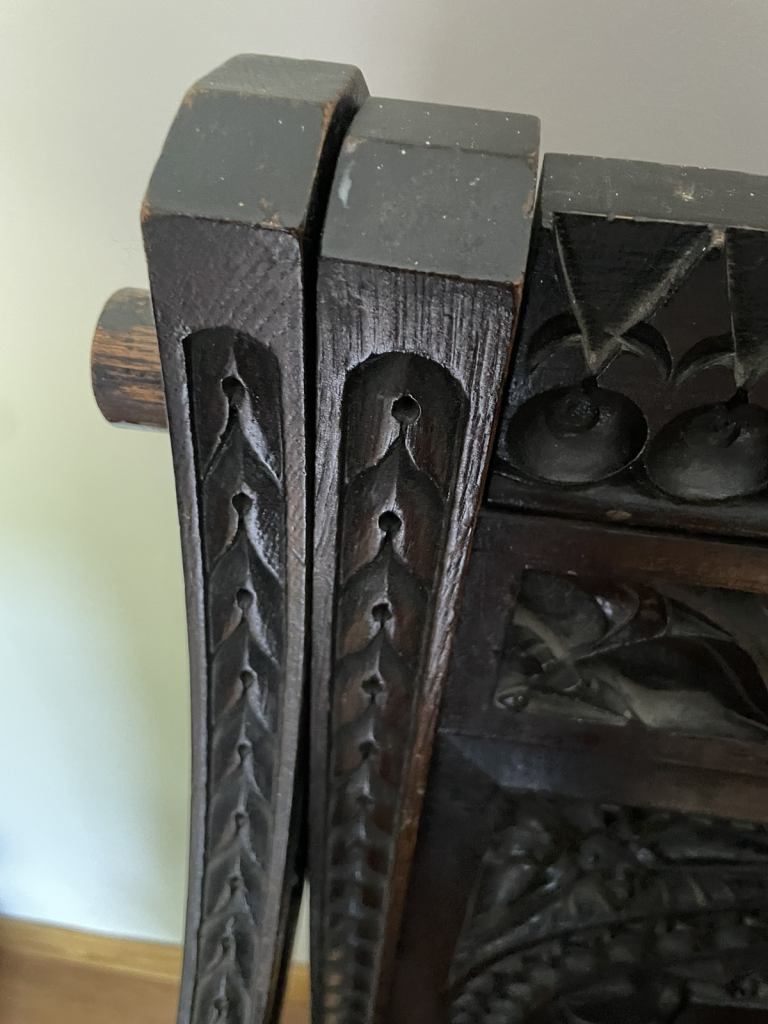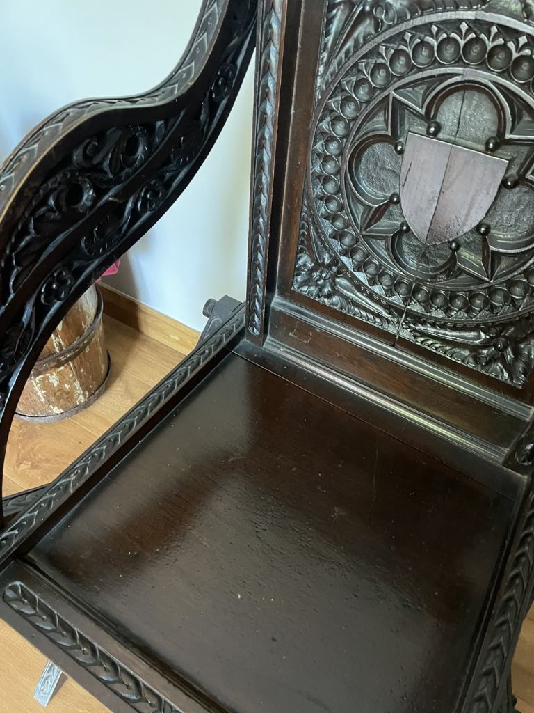Posting for 12+ yearsCanterbury abbots style antique oak carved chair.