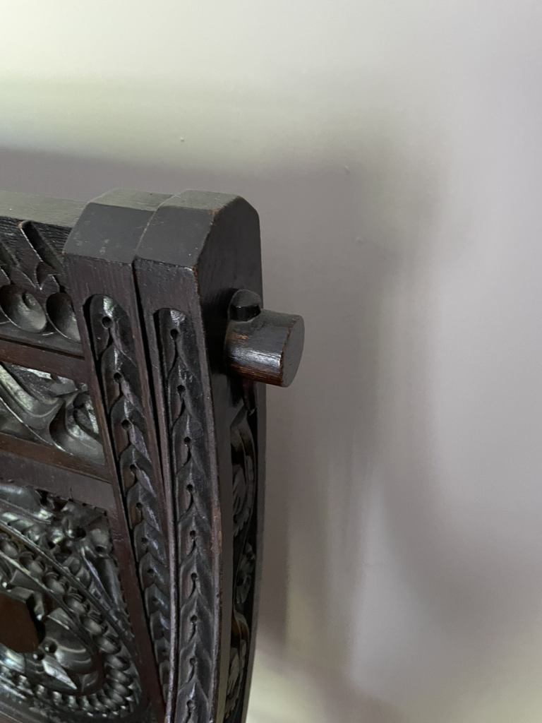 Dark oak carved antique chair. Canterbury abbots style.Unique design with wooden dowels holding frame. Very heavy, sturdy and decorative but comfortable chair.