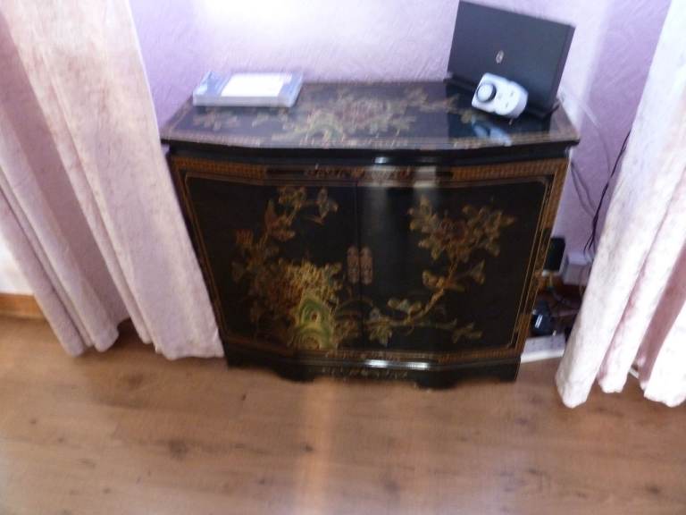 Chinese Black Lacquer Cabinet For Drinks Etc Size approx 82w X 33d x 72h cm In Good condition. Light reflecting on door not a defect Bargain £125 ( NO TEXTS PLEASE )