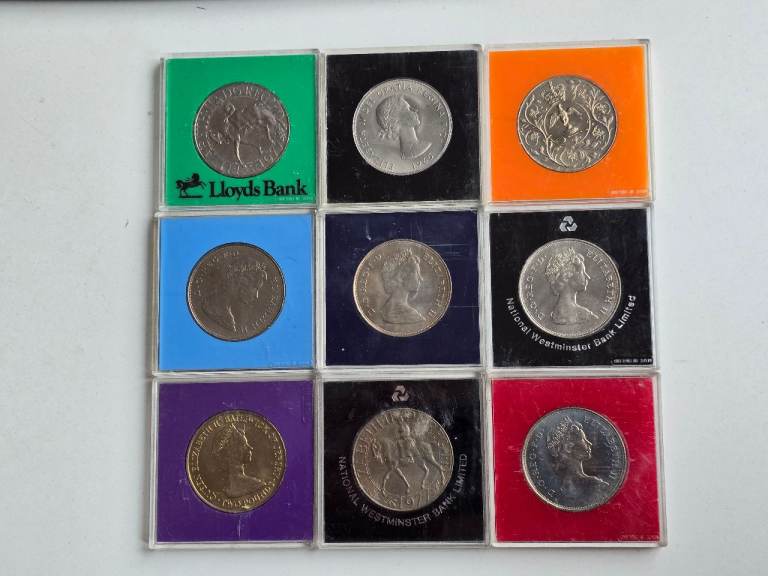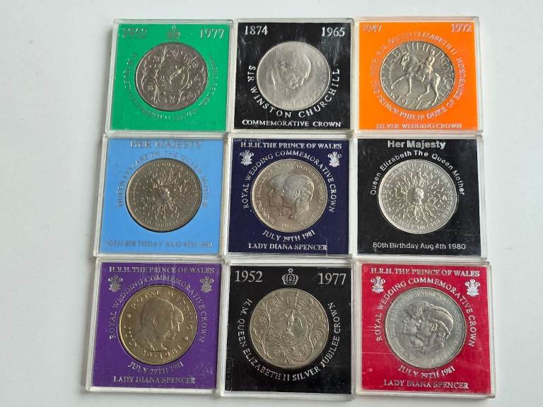 Collection 9pcs Various Vintage Newer British Crowns in cases Lot #2