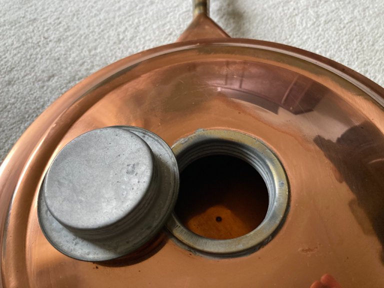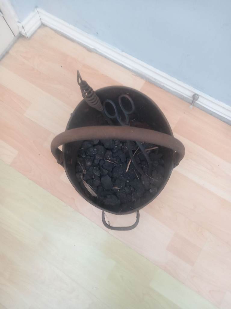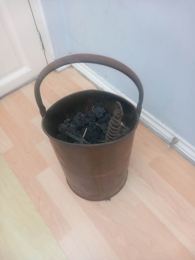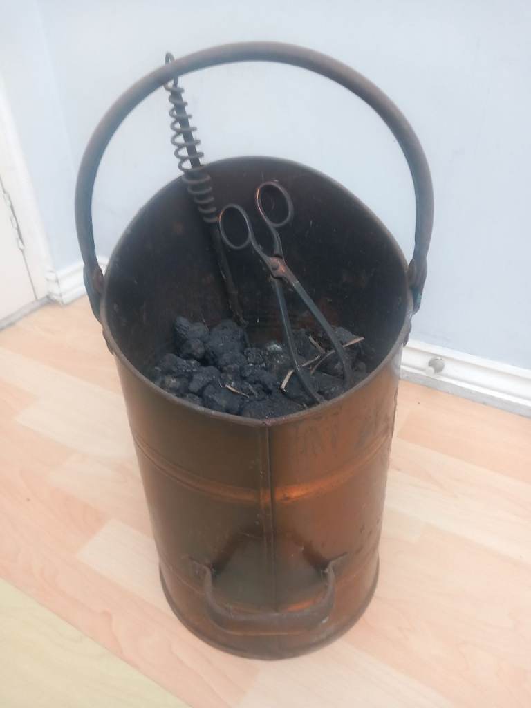 Copper Antique Coal Scuttle found in loft do over 60 years old full of coal about 2.5ft X 1ft has two tongs with it collection only £100 or very near offer
