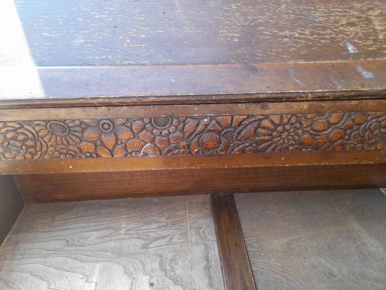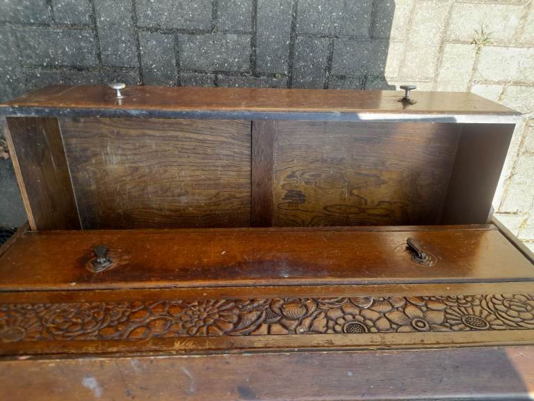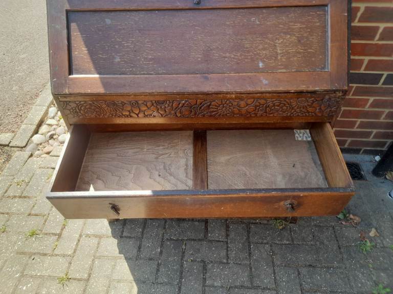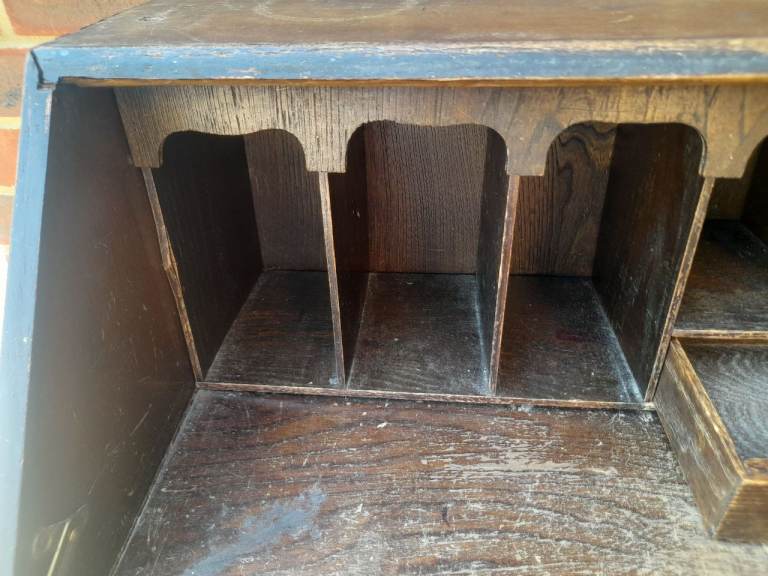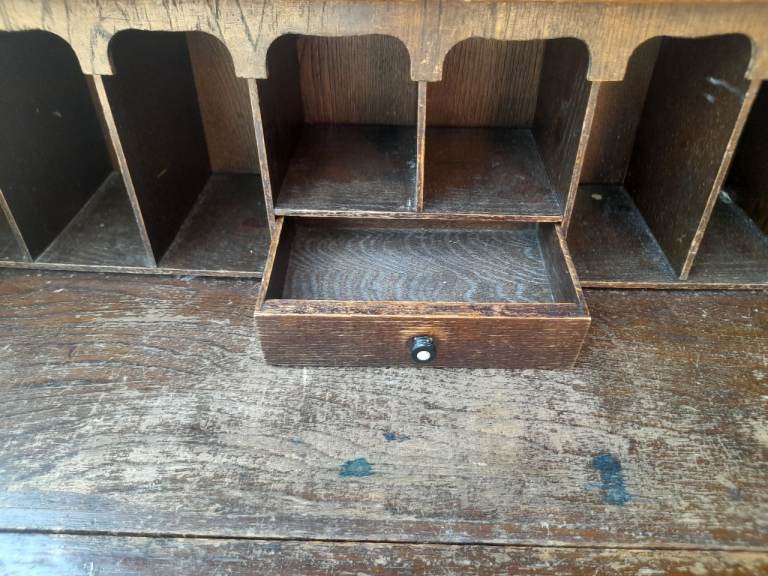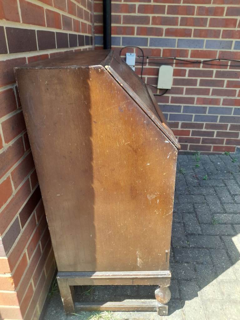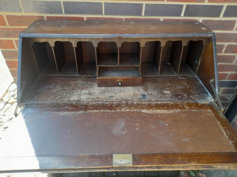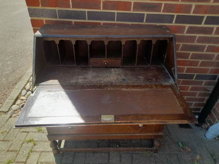 Late Edwardian period oak writing bureau raised on turned forelegs.