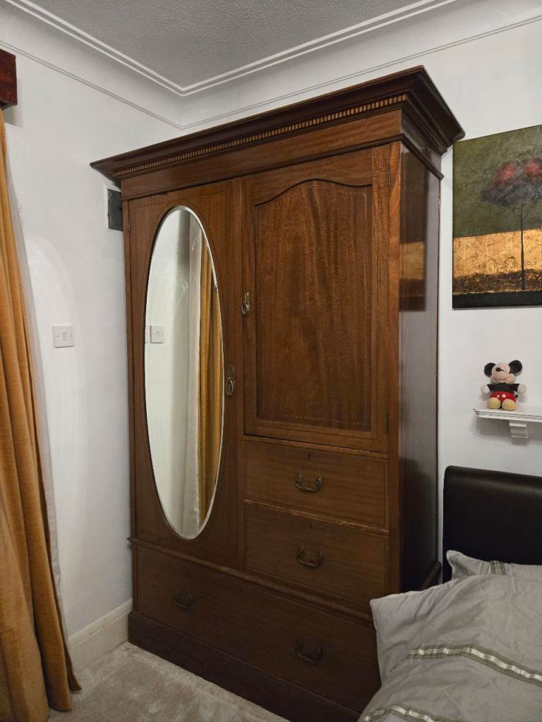 Beautiful wooden (teak)?)Edwardian Wardrobe, come in 3 parts for easy moving. D:50x W:140xH:210cm.Sold as seen.