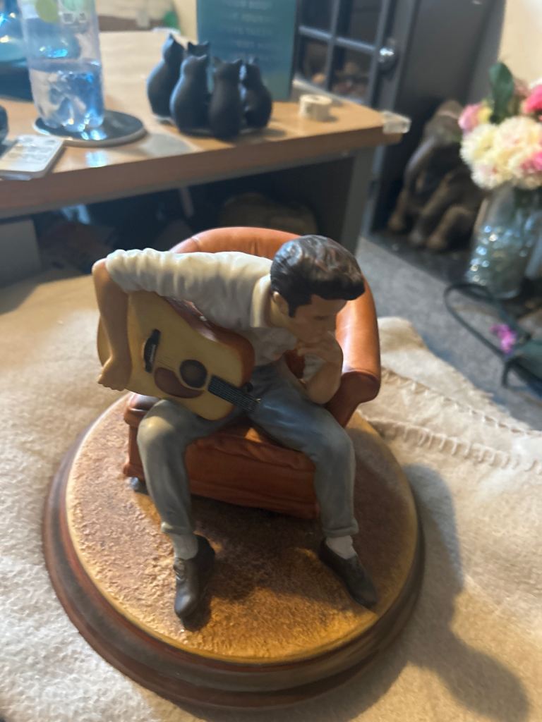 Elvis Presley figure on chair fortunately guitar slight damage but plays love me tender even though it’s slightly crackly due to age pick up only thanks heavy