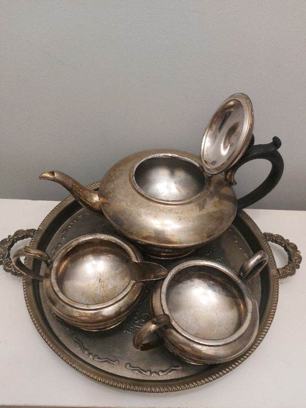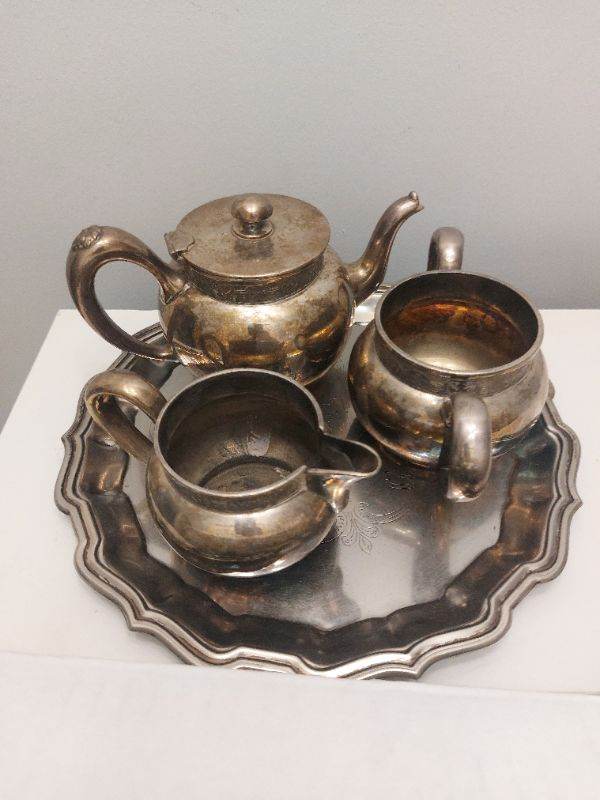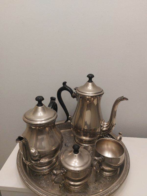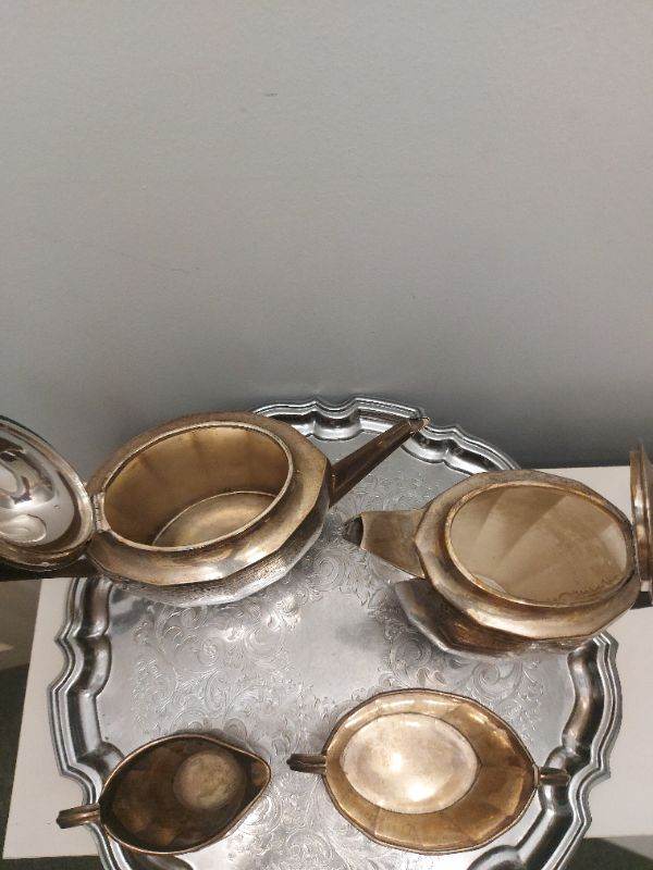 Four Sets of Silver Plated Tea and Coffee Sets with Tray and Sugar Bowl Vintage