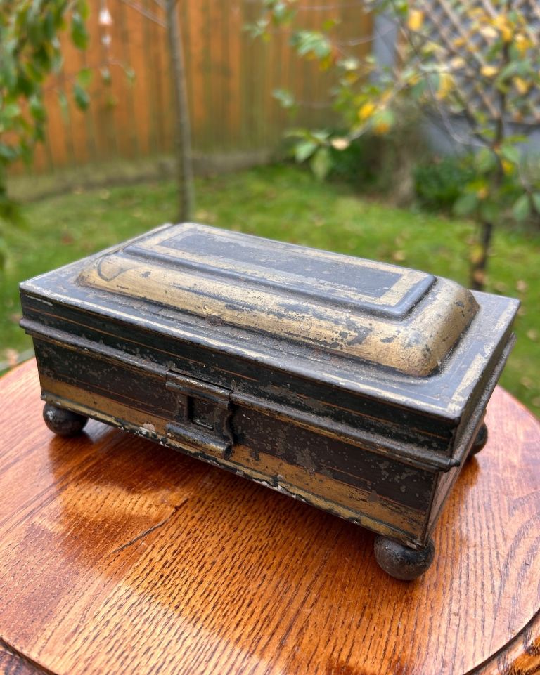 This Georgian metal spice box features sections for cinnamon, cloves, nutmeg, allspice, mace and ginger.