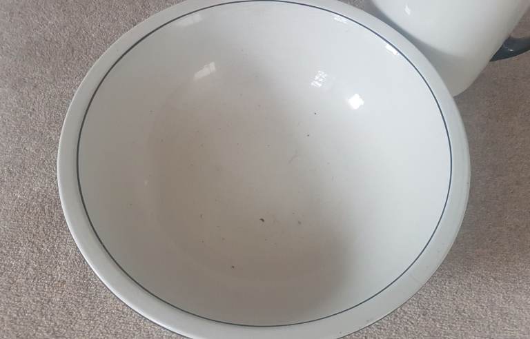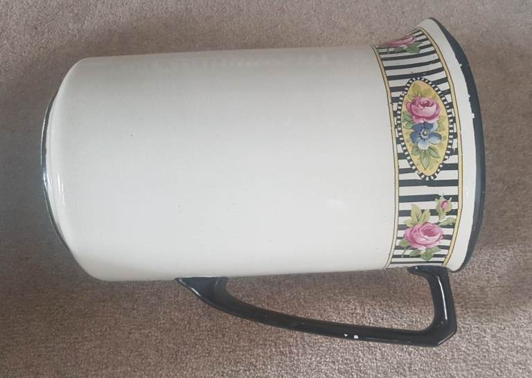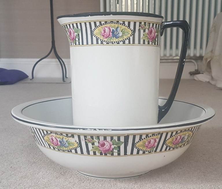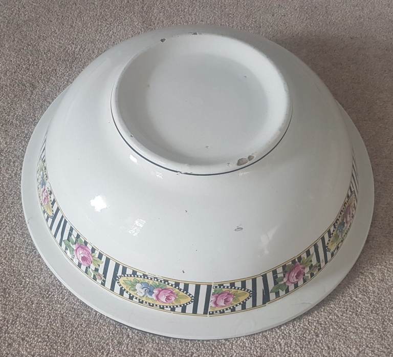 Large vintage wash bowl and jug, a very impressive pair. Bowl is 42cm diameter and 14cm high. No markings to identify or age it, but it’s pretty old, so I suspect early-1900s. It has a few very minor marks and chips, as you might expect from being used for a long time. Bowl is 42cm diameter and 14cm high. Jug is 30cm high and 28cm wide from spout to handle (19cm rim to rim). Collection only from Pottery Close, DE56 0HU.
