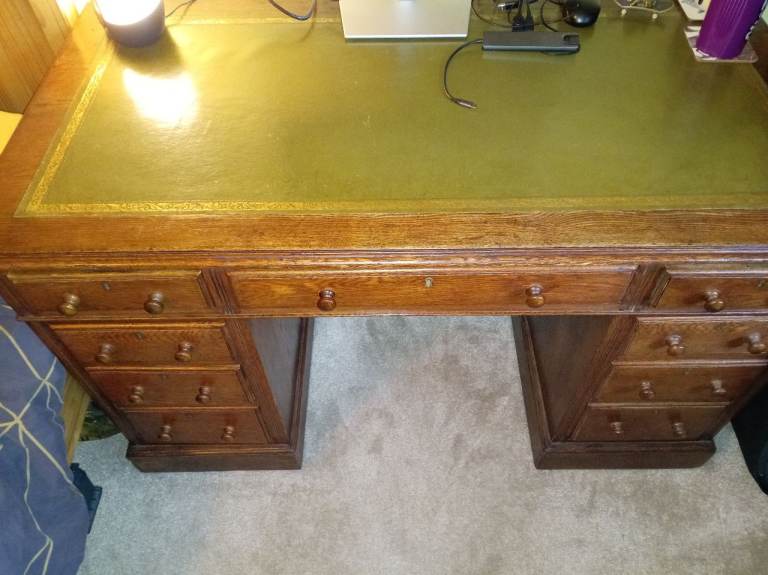 Green leather top kneehole desk with lots of drawer space. The top can easily be taken off, so this desk is easy to move. Collection only from E10. Open to sensible offers