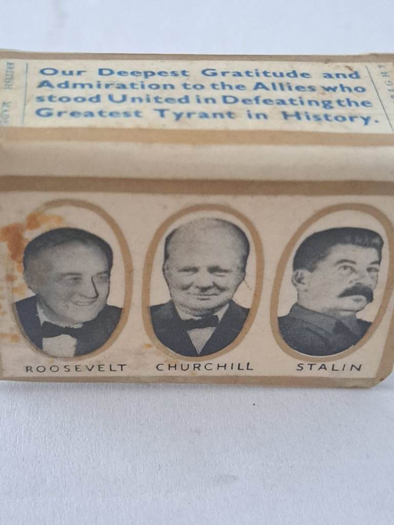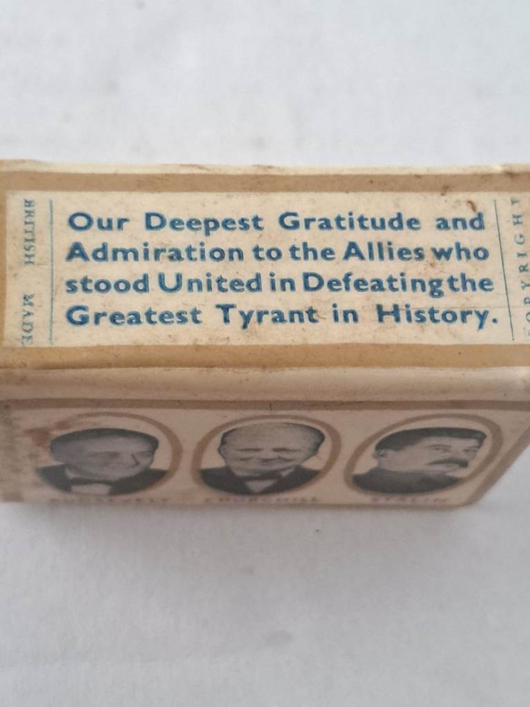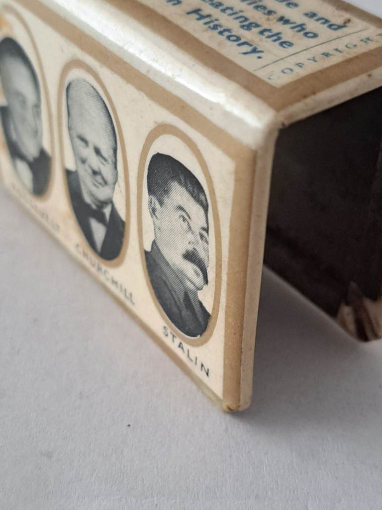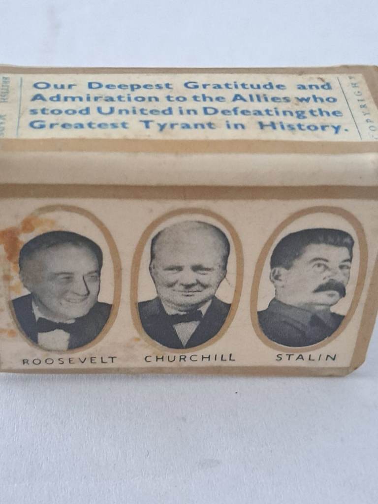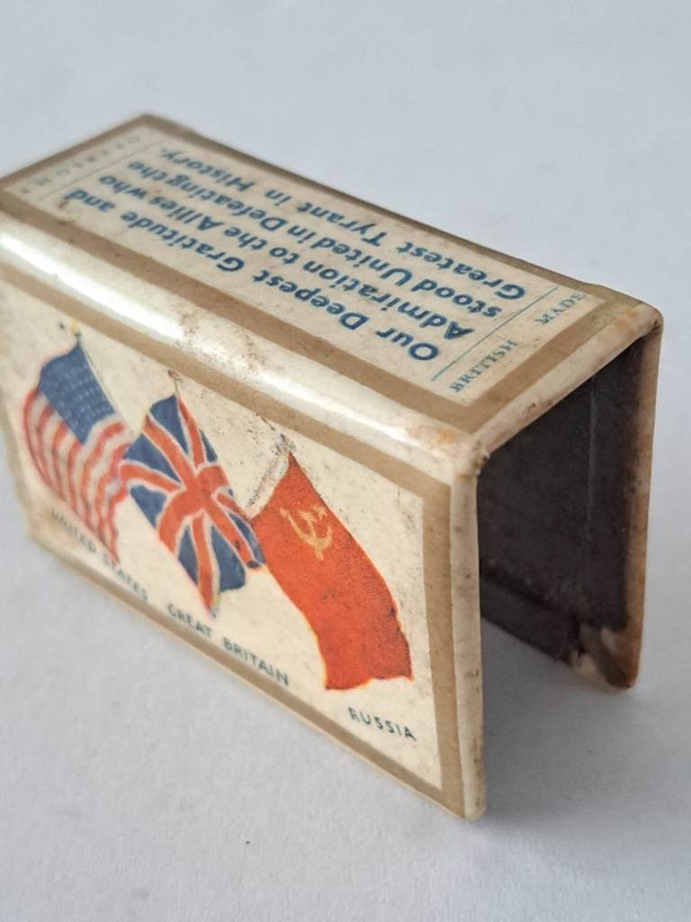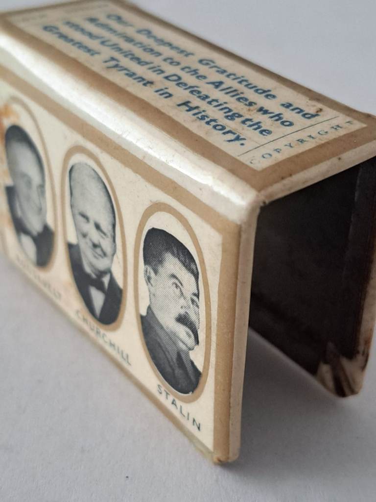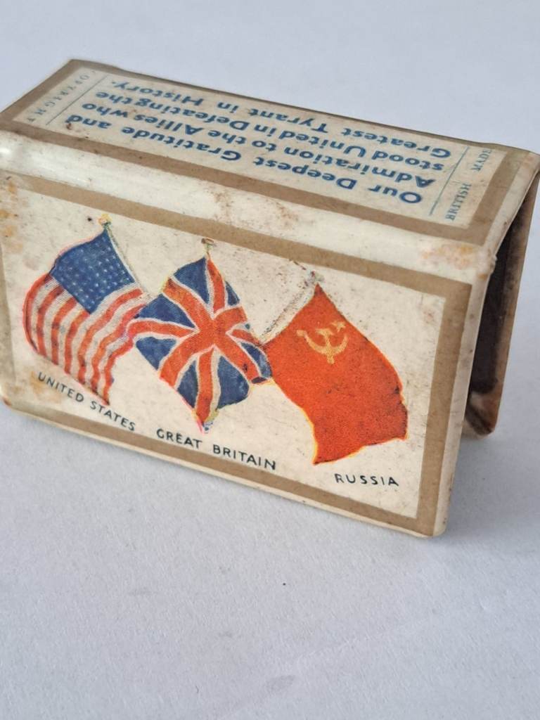 Post WW2 match box holder celebrating the defeat of Hitler by the 3 nations.
