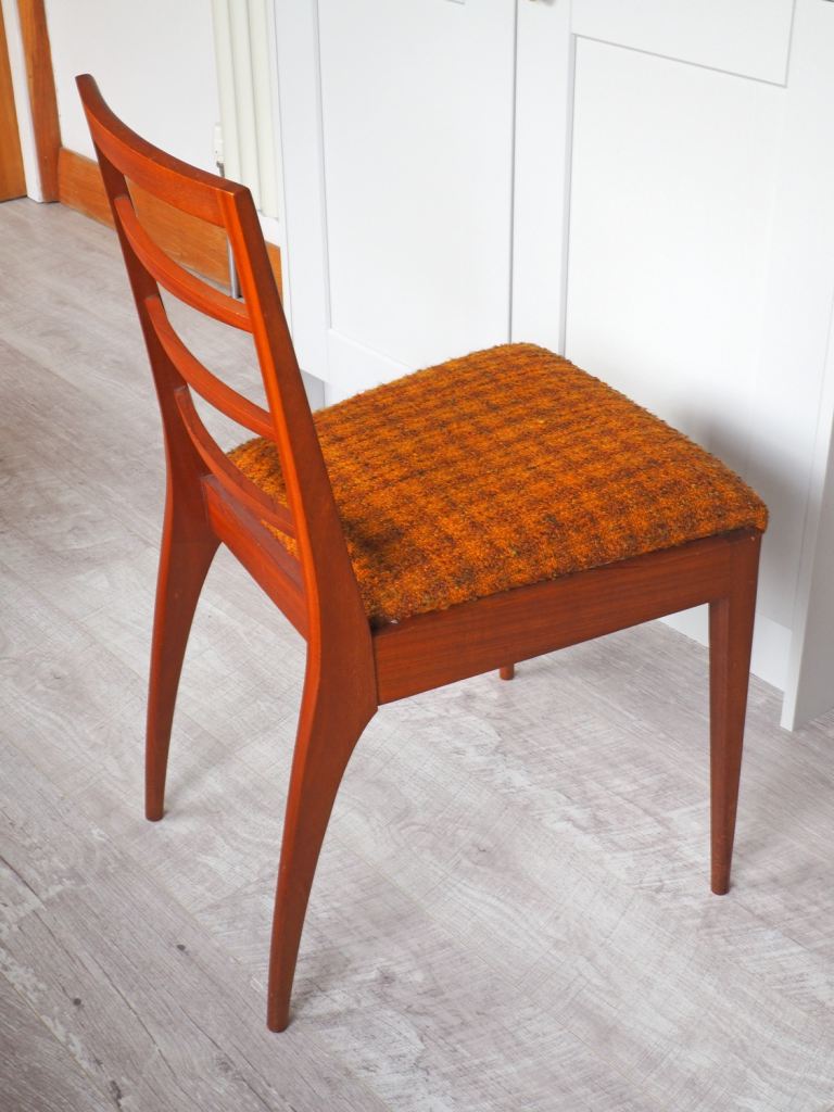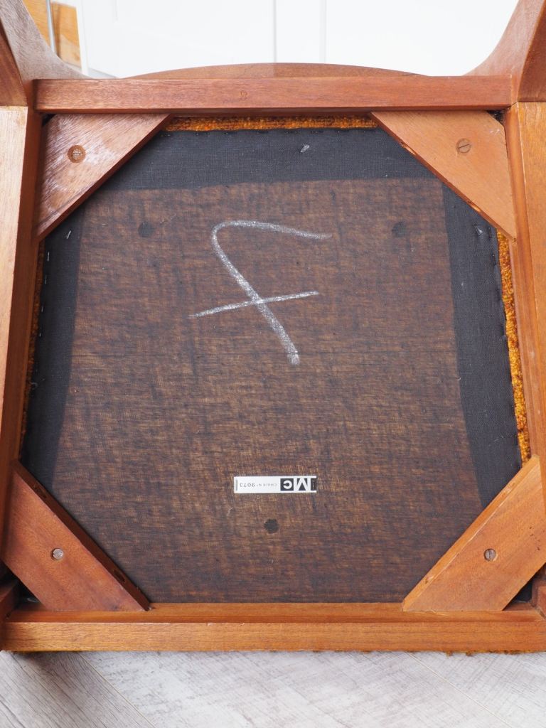 60s 70s, Teak, unrestored & in GREAT condition. Original boucle fabric with no wear, little used, bought new. Remove 4 screws shown to easily reupholster seat pads if desired. Simple, minimal & elegant 60s design from renowned mid century manufacturer.