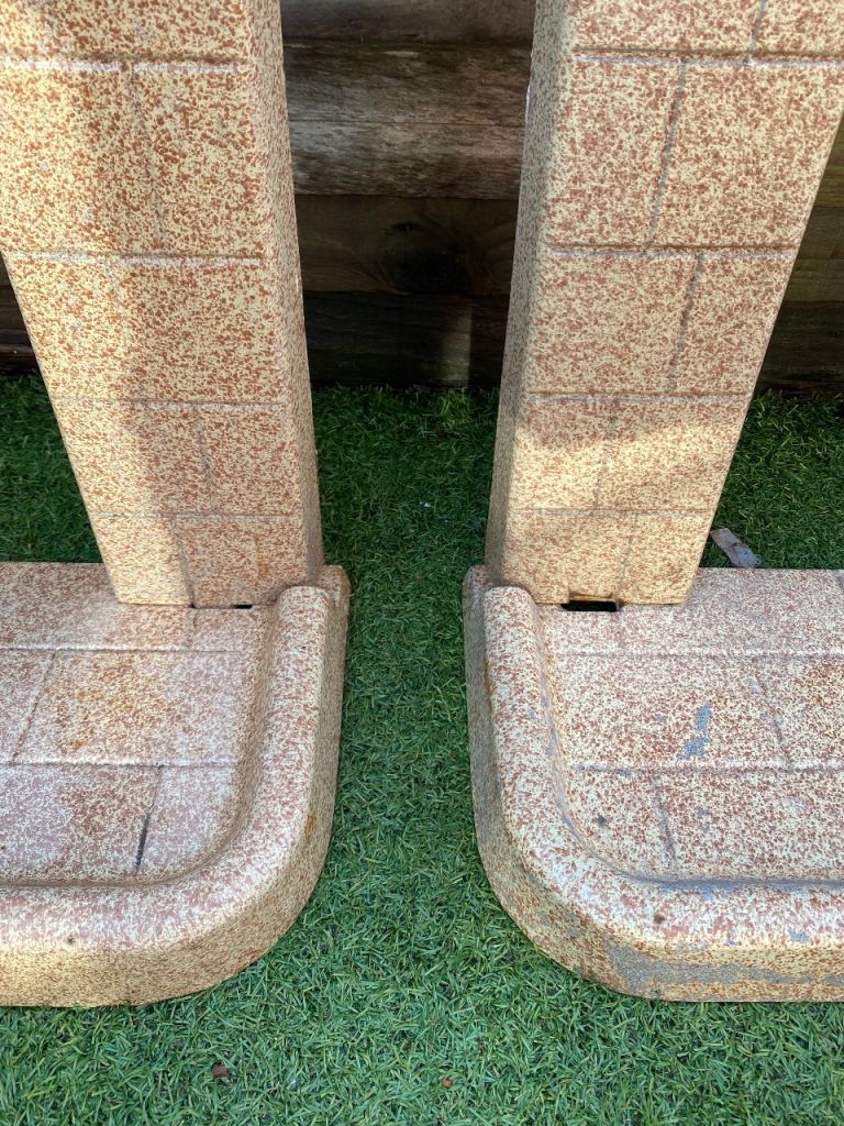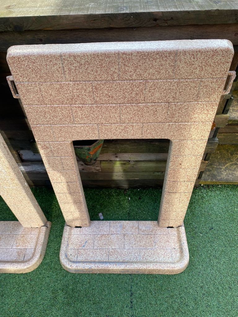 Matching pair of unusual 1920’s/1930’s cast iron bedroom fireplaces with hearths. Beige and brown mottled enamel finish with simple brick effect design. Previously overpainted, most of which has been removed, some surface rust in places. On one the tabs to locate the fireplace into the hearth have unfortunately broken off.