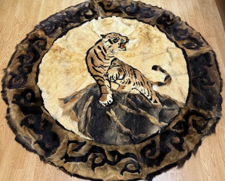 Huge, impressive Indian Tiger art made with real fur. A rare relic of a bygone era (Pre 1950's), this imposing wall with fine whiskers and excellent fur coverage and clean, light, natural colour. This was wall mounted in a circular hand made frame around 160 cms.