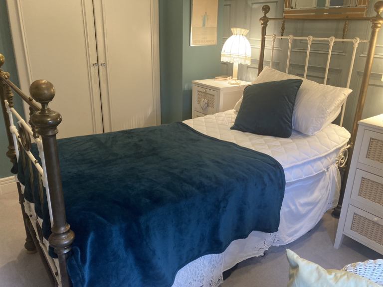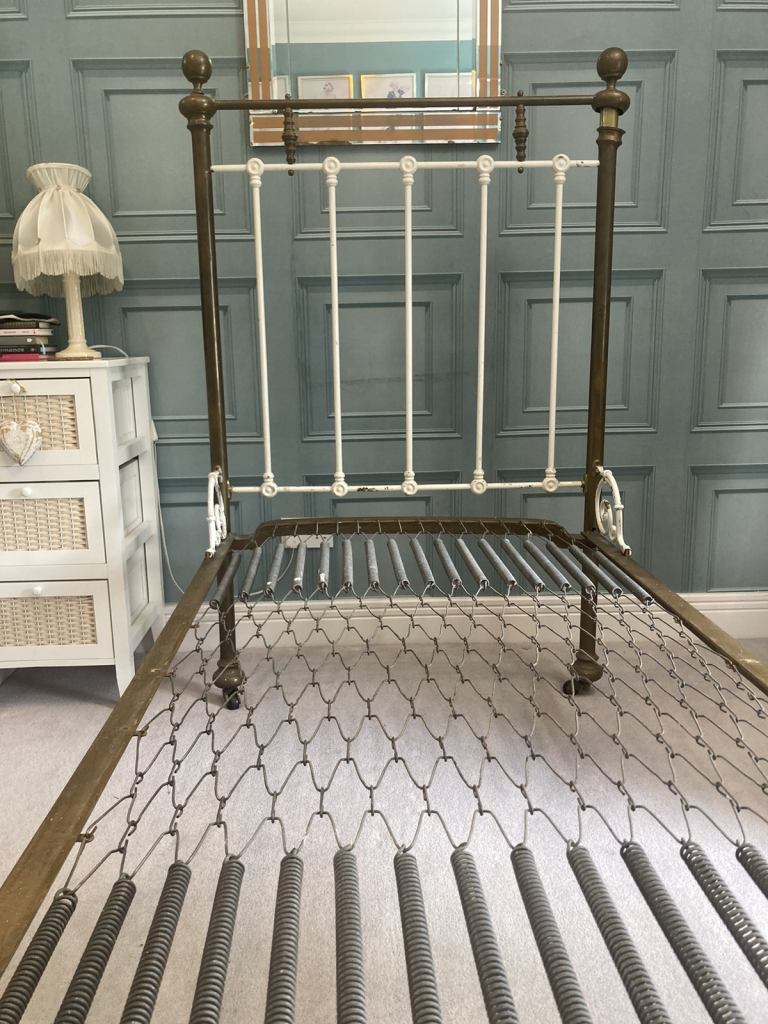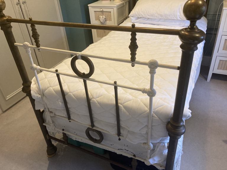 Original Victorian single brass bed on castors. With mattress. Now dismantled for transportation. Pretty scrolls at the sides.