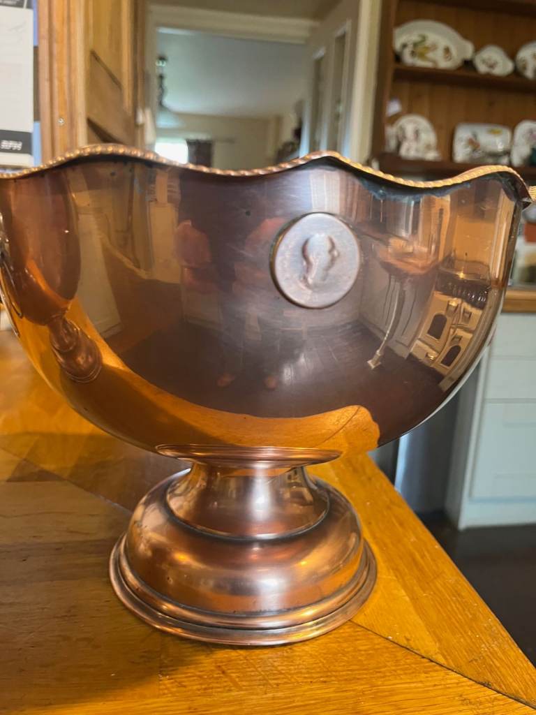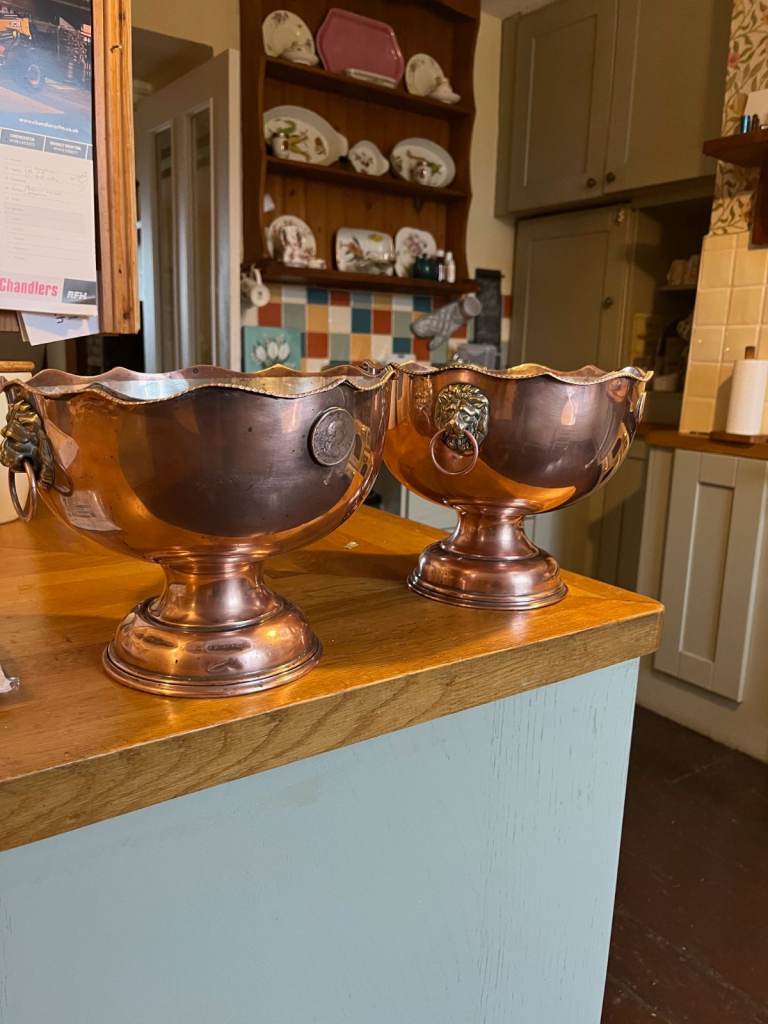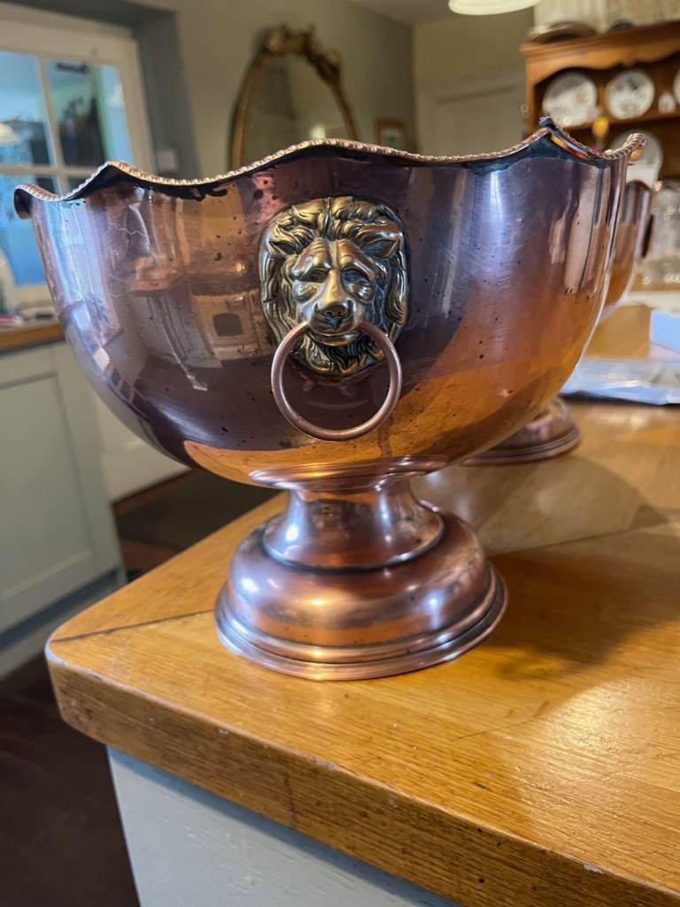 Pair matching late nineteenth century punch bowls or ice buckets.Silver plate on inside. Lion head brass handles.English coins embossed on sides.