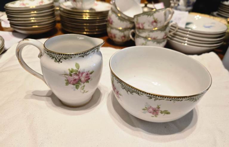 12 cups, 12 saucers, 12 side plates, 2 main dinner plates, 1 milk creamer and 1 small serving bowl.