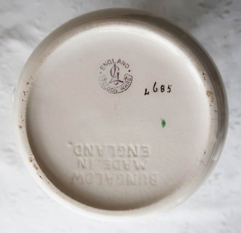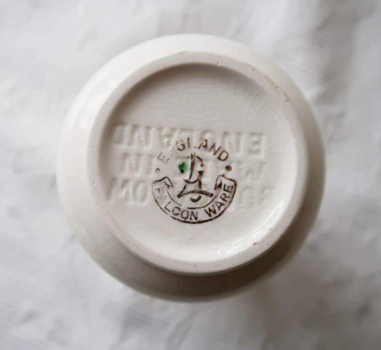 Falcon Ware was made by Thomas Lawrence Ltd at Falcon Works in Longton, England. The company started in 1892 but the trade name ‘Falcon Ware’ did not come into use until 1944. ‘Made in England’ was added in 1947. The company was taken over in 1938 by Shaw & Copestake. Falcon Ware ceased production in 1964.