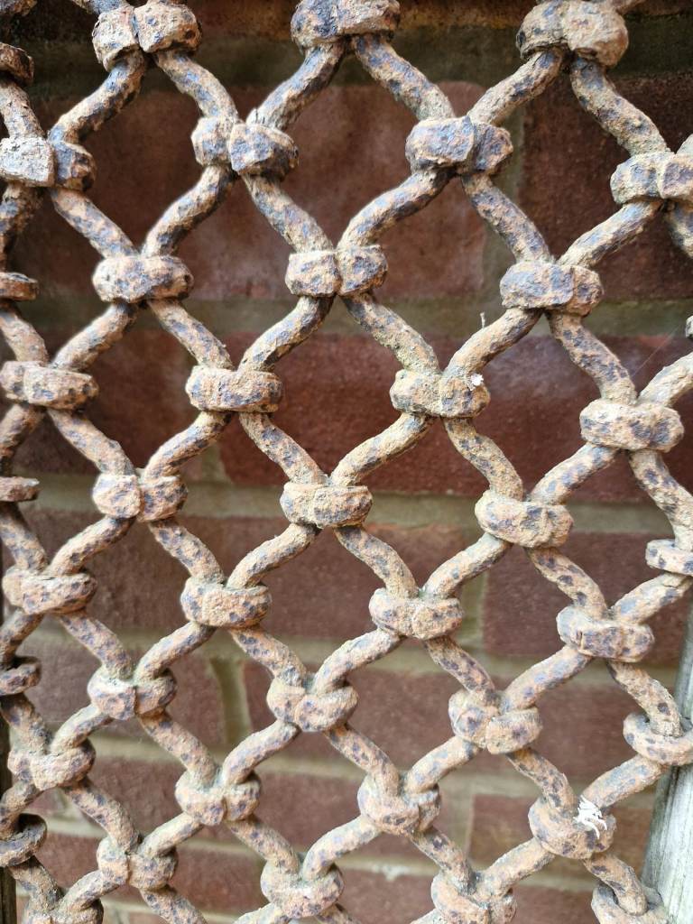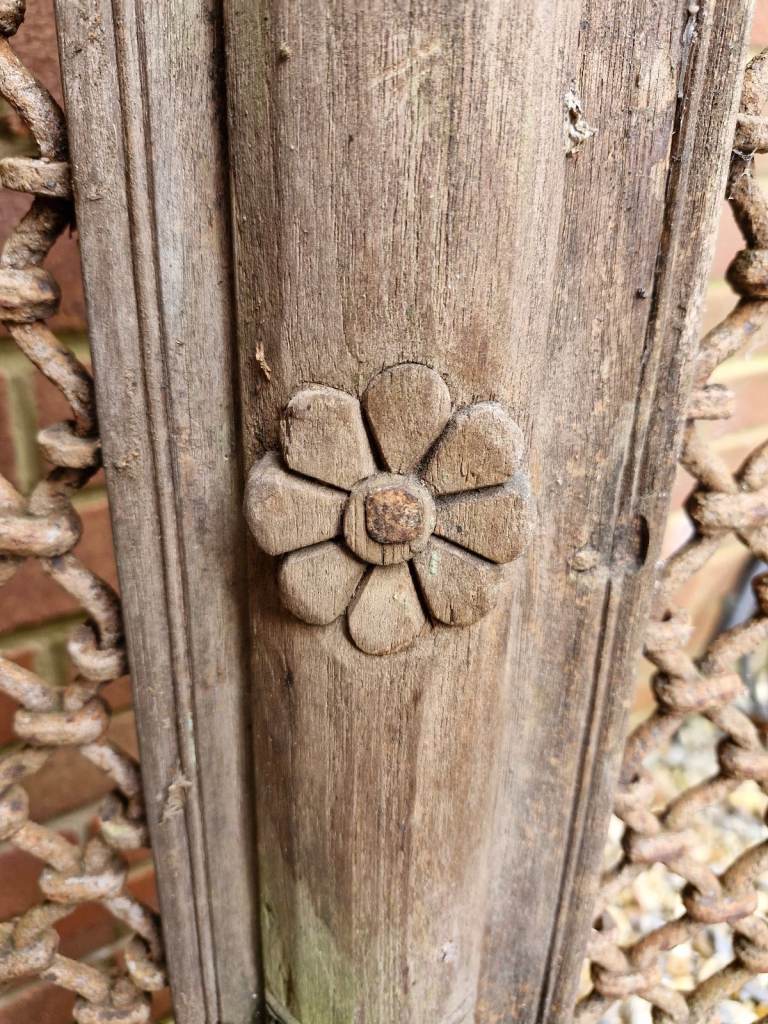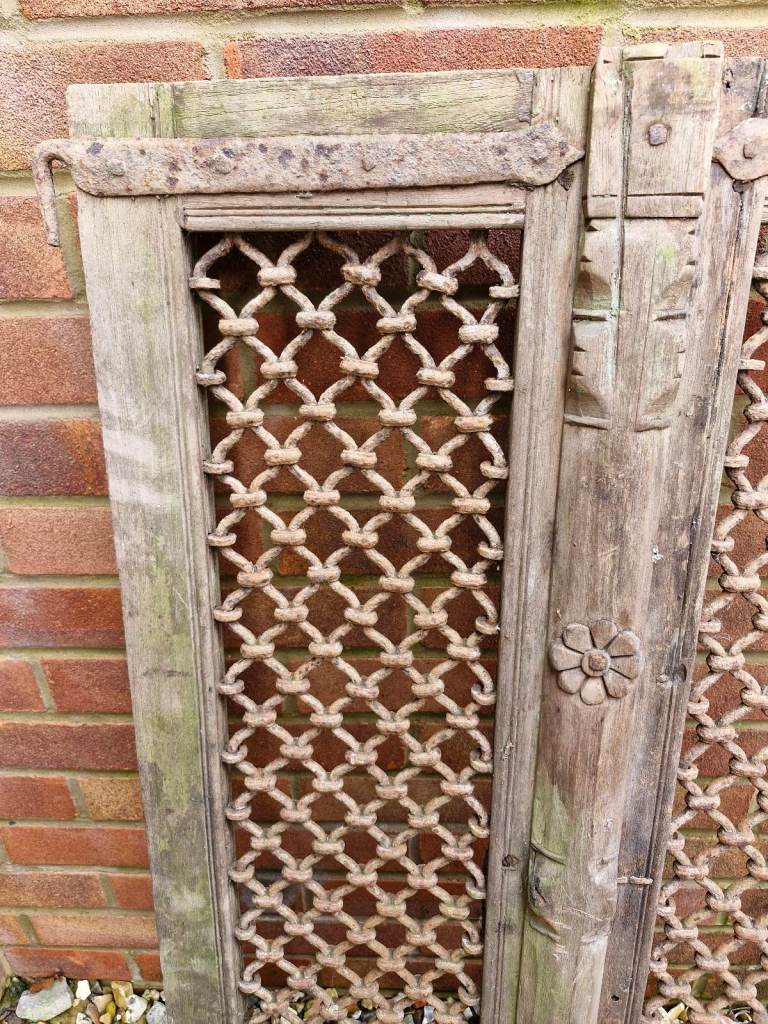 Rare, beautiful hand-forged ornate iron window grilles in their original wooden hand carved casements. Hand forged iron hinges. Salvaged from a house in Chelsea.