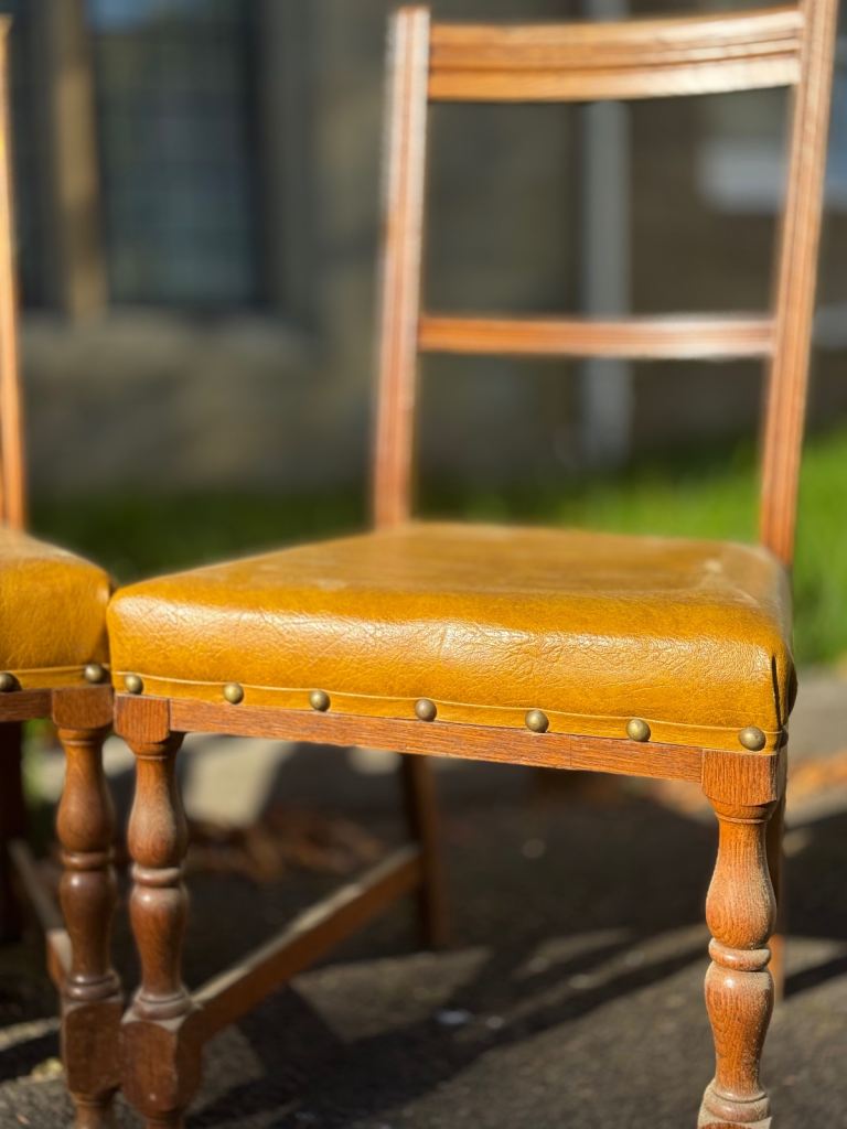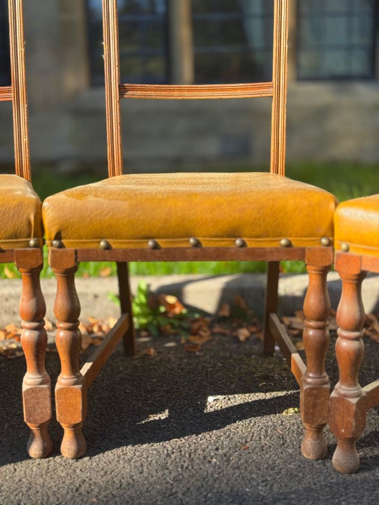 Likely late Victorian to early Edwardian (c.1880–1910), these chairs feature turned front legs, stretcher supports, and studded upholstered seats in a warm golden tone. Solid, characterful, and full of period charm.
