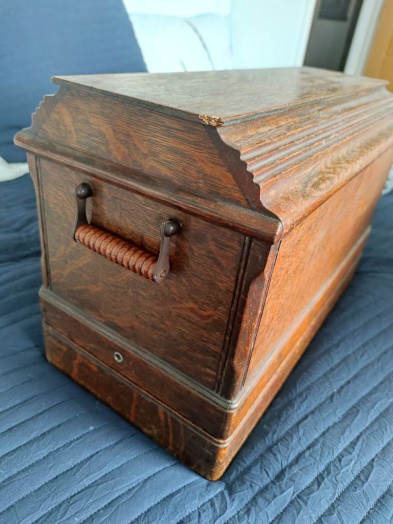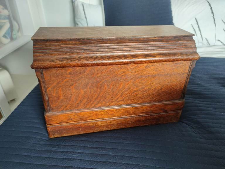 For sale used Singer sawing machine with wooden box, working.