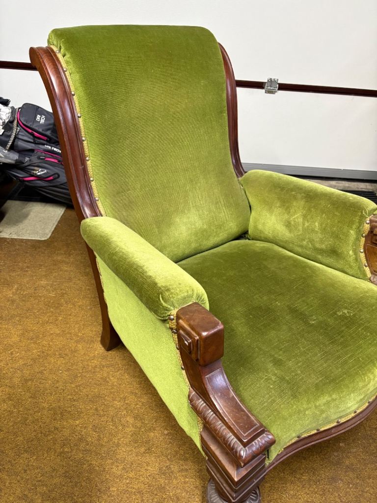 Victorian antique armchair green covering on mahogany frame in good condition condition.