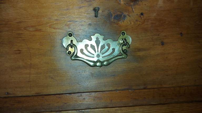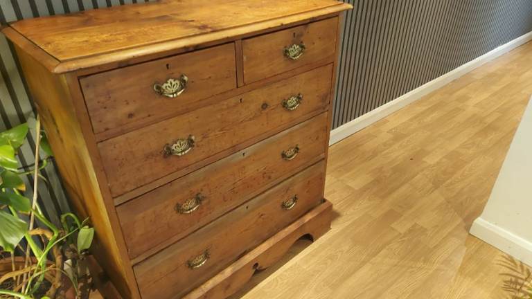 Genuine Victorian pine chest of drawers with five drawers. Elegant brass fittings and plinth detail. Approx 100cm tall by 86cm wide, 44cm depth. Much loved but moving necessitates sale. Buyer collects.