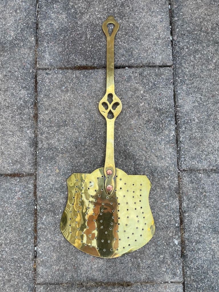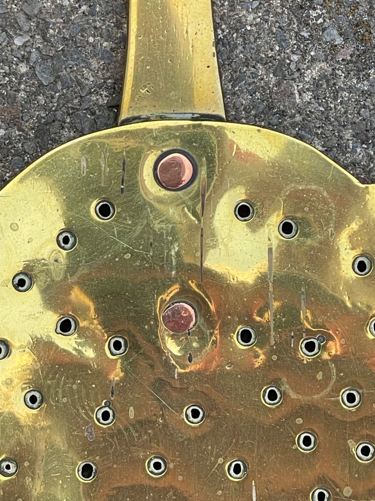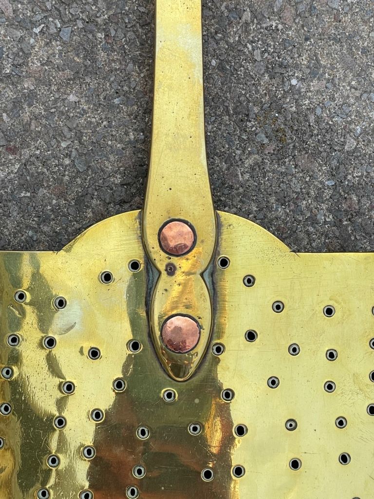 Victorian brass chestnut roasting skillet/skinner with copper rivets. Circa 1820-1859. Dimensions 20 inches by 8 inches. Cash on collection at Poole