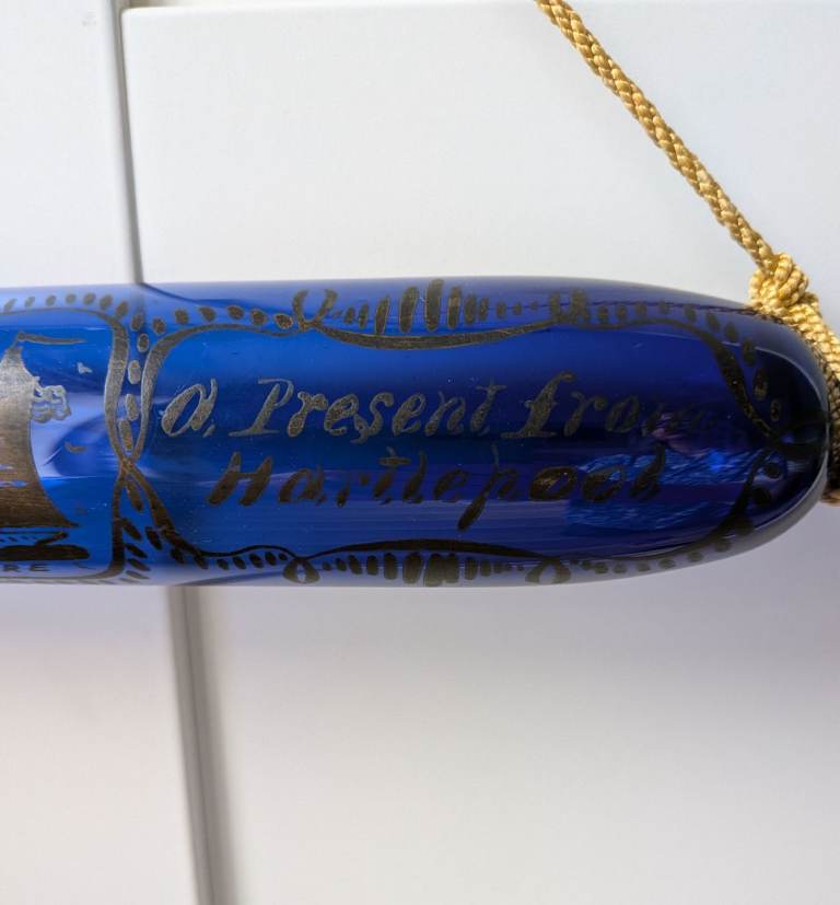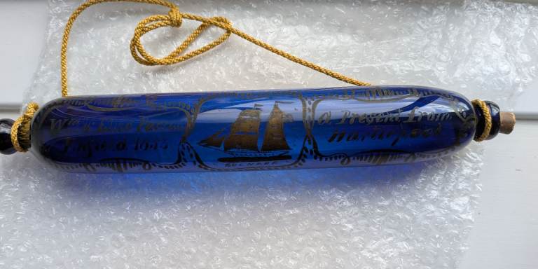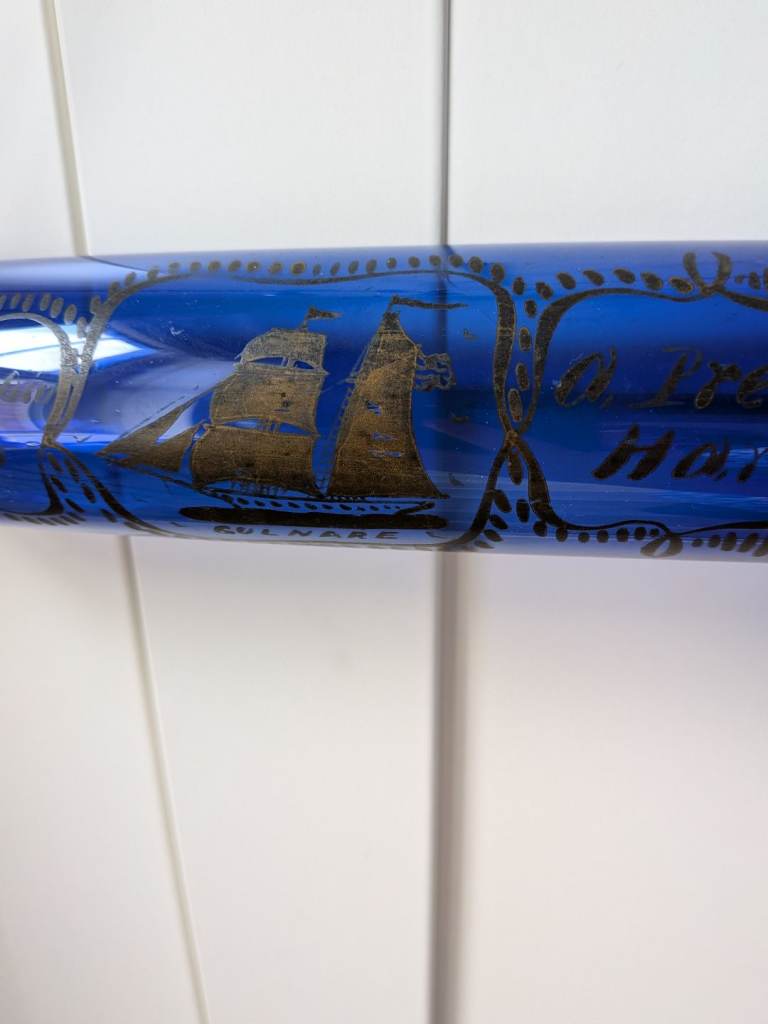 Antique cobalt blue Victorian rolling pin. Hand painted 'Wm and Eliza Parsons Enfield 1853 A present from Hartlepool ' and a painting of the sailing ship Gulnare.